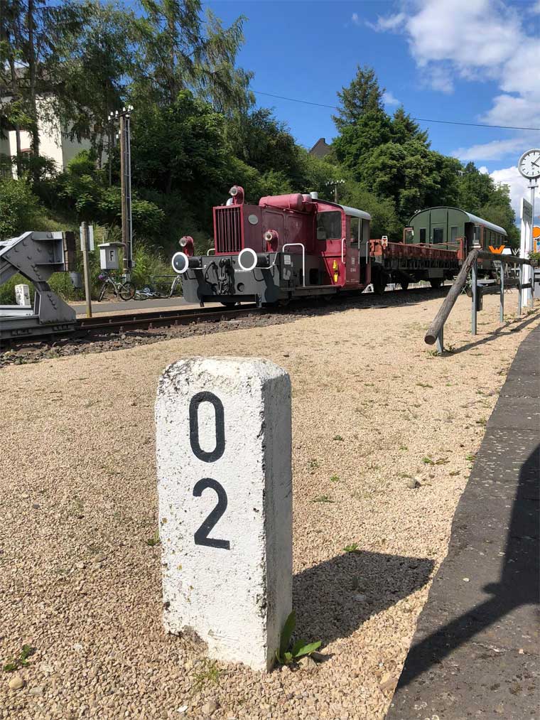 km 0,0 der Strecke Pronsfeld 0,0 - Waxweiler 8,463 - Streckenende 8,617 | ||