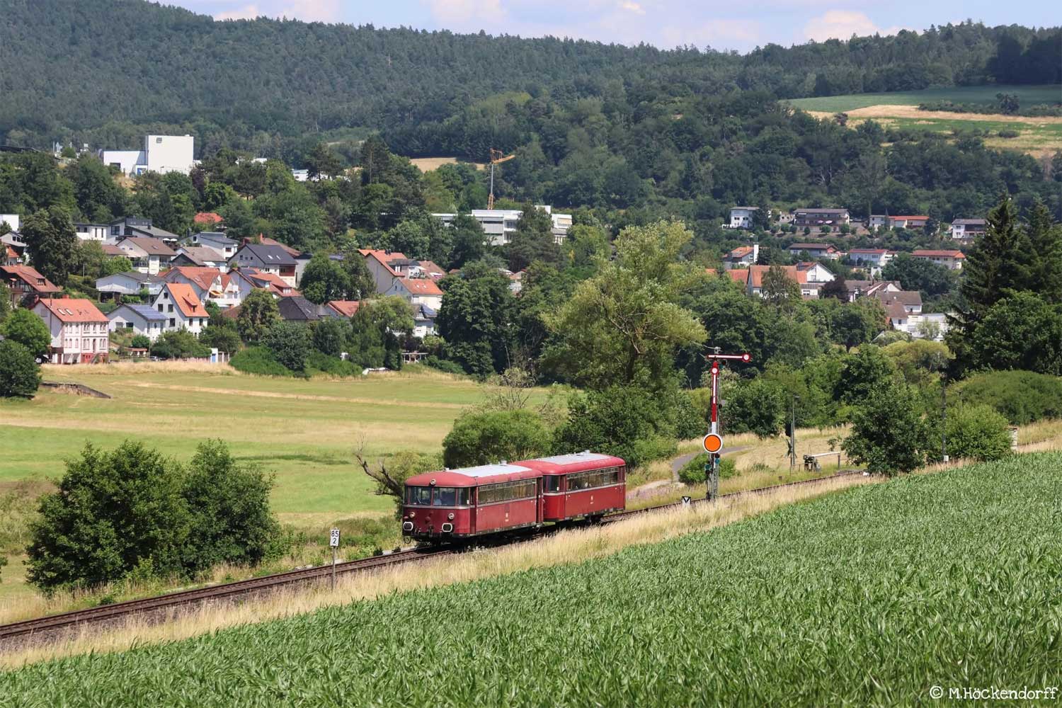 Links der ehemalige Bahndamm der Strecke Burg- und Nieder-Gemünden 0,0 - Kirchhain (Bez Kassel) 20,08