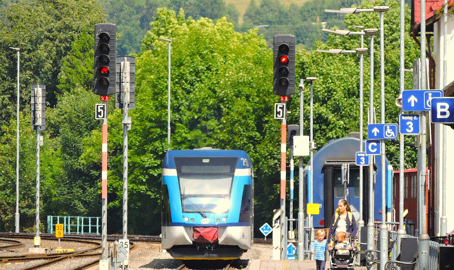 Der Zug der CD kommt von Krnov (Jägerndorf), befindet sich hier auf polnischem Gebiet und und fährt nach dem Kopfmachen auf dem daneben liegenden Gleis zurück auf tschechisches Gebiet in Ri Jeseník (Freiwaldau-Gräfenberg) - Hanušovice (Hannsdorf).