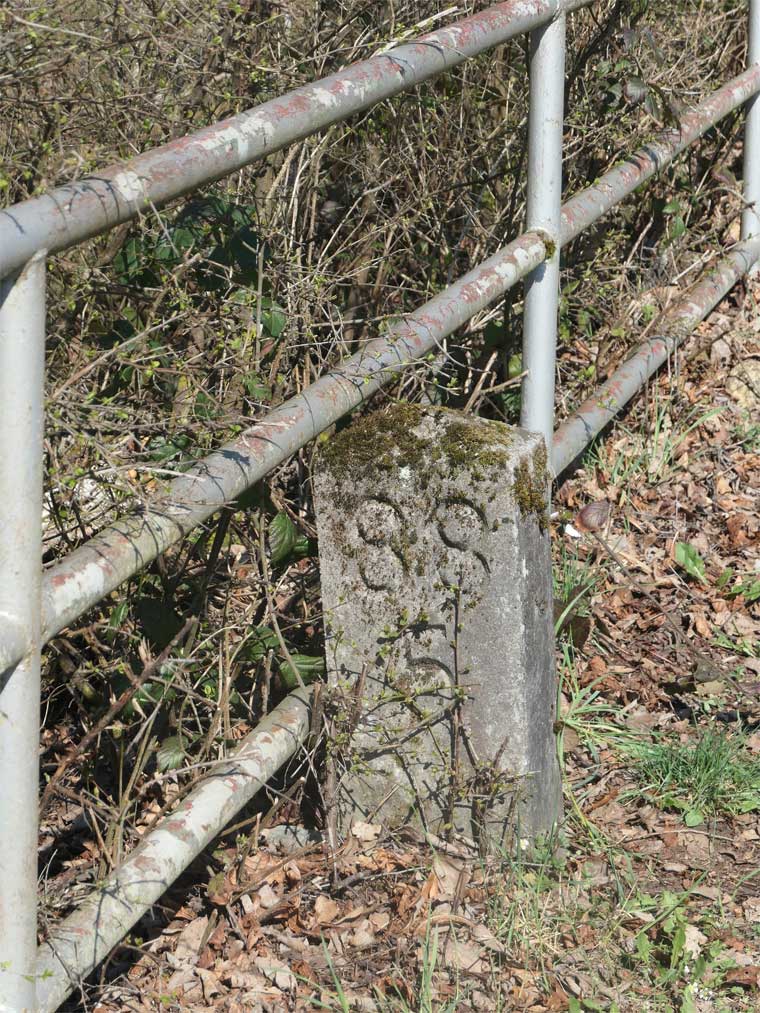km 92,0 (Tafel rechts) und km 92,2 (Stein links) in Hetzerath - Blick Richtung Koblenz
