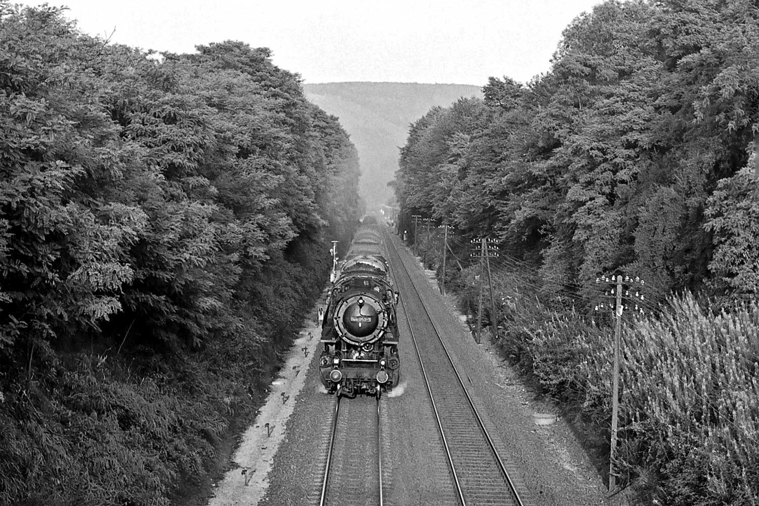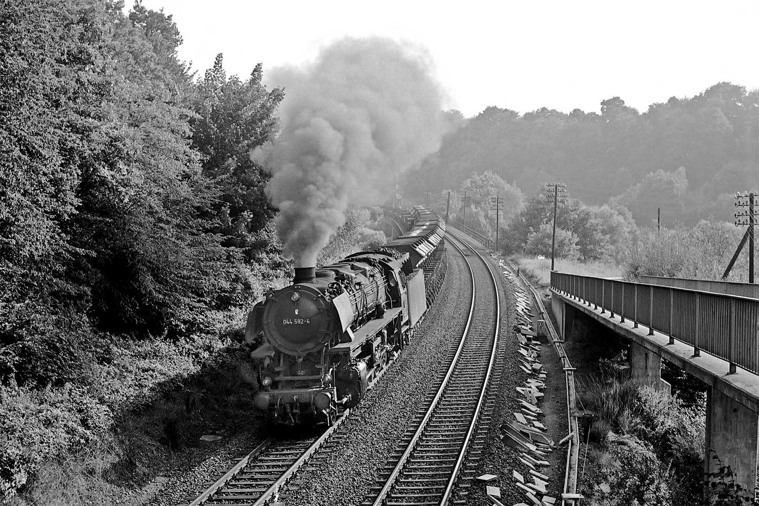 Würgendorf - km 105,8 - 212 150 mit einem wunderbar gemischten Güterzug am 26.07.1983