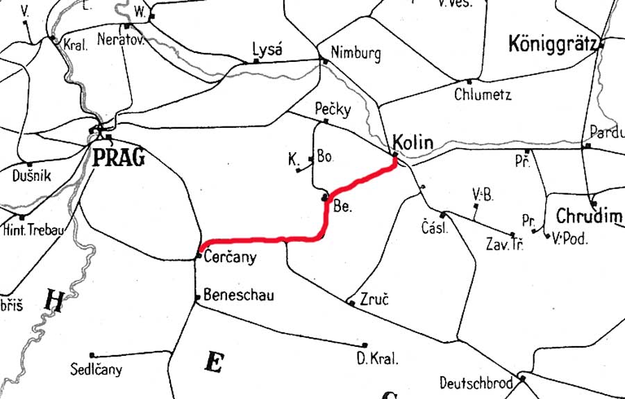 Kolin (Elbe) / Kolín 0,0 - Betschwar / Bečváry 15,880 - Ratais (Sasau) / Rataje nad Sázavou 37,989 - Tschertschan / Čerčany 65,511