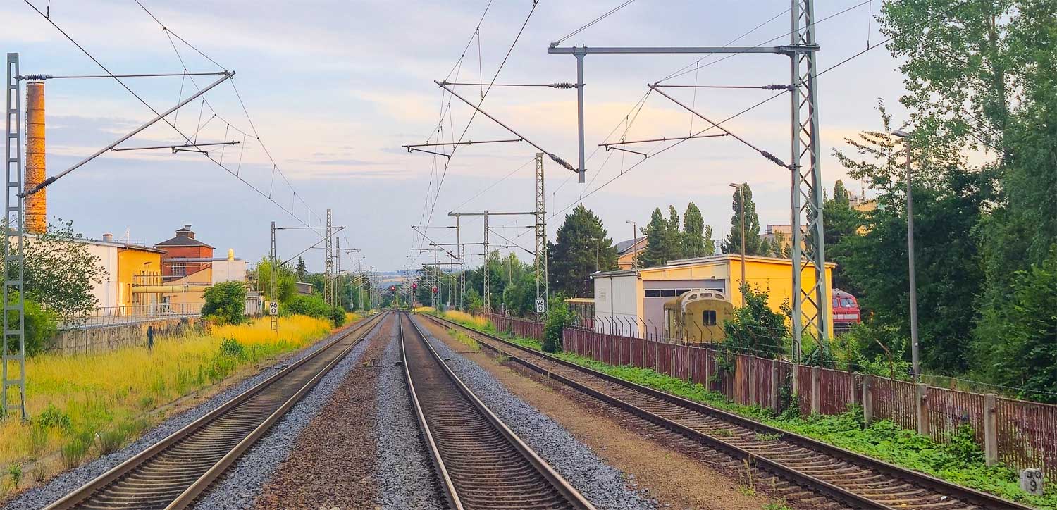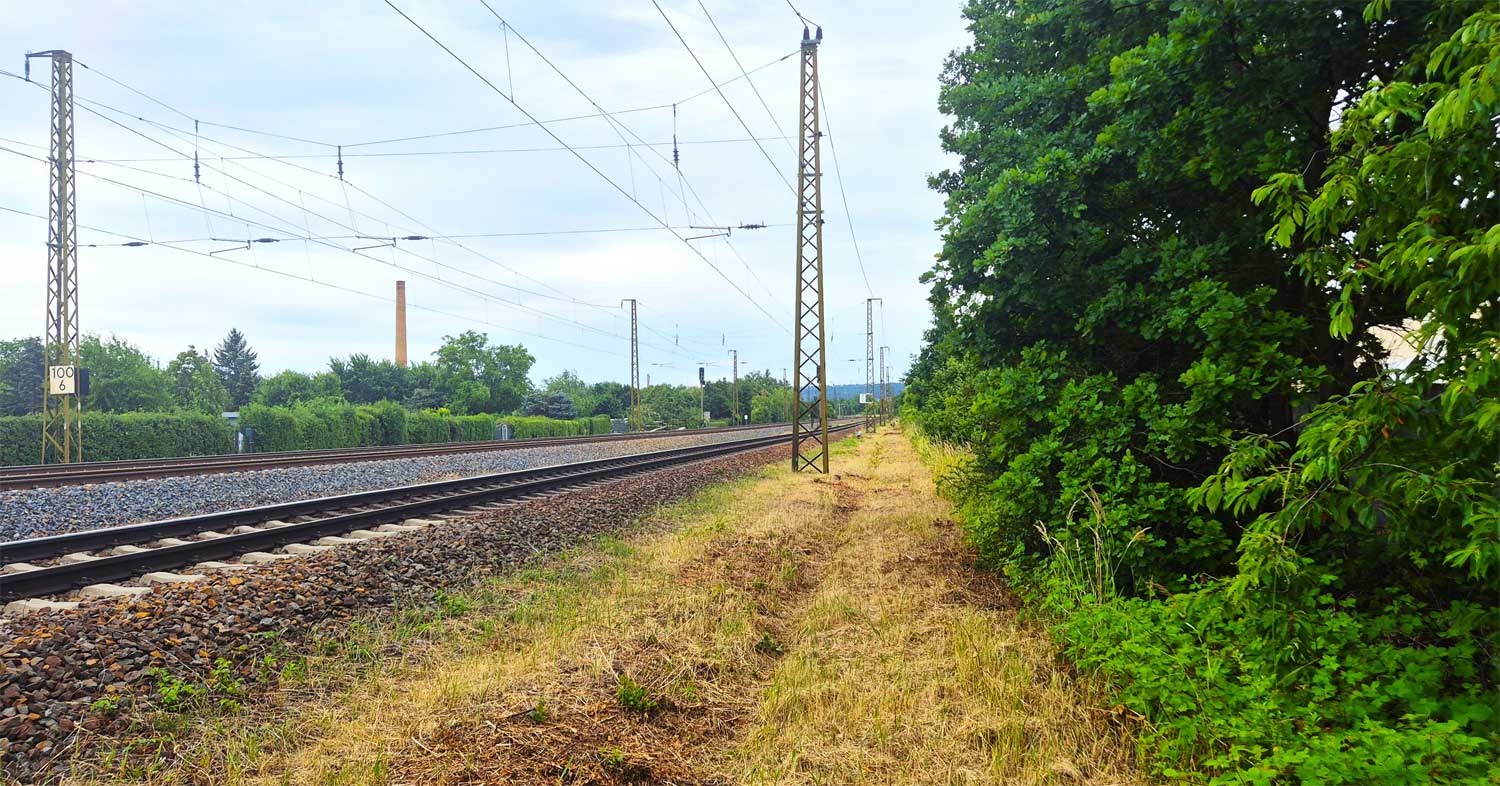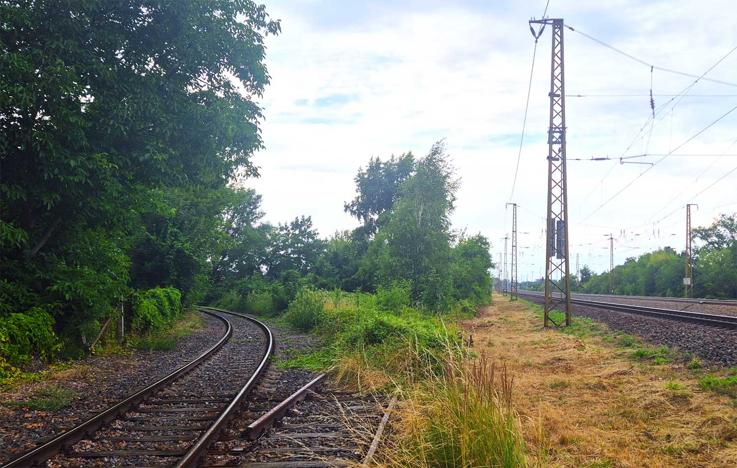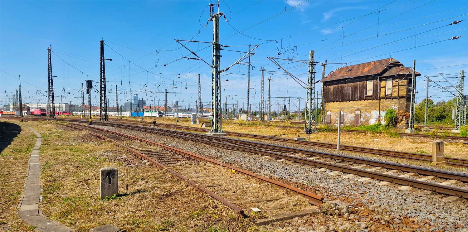 Ganz links zwei Bahnhofsgleise und links anschließend