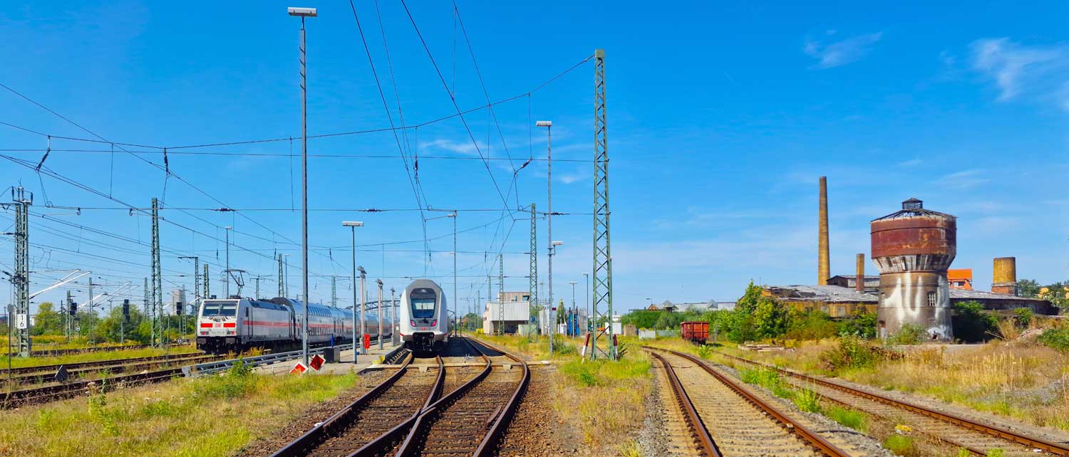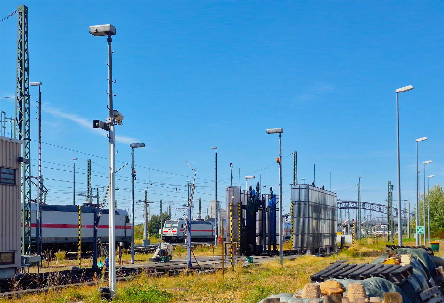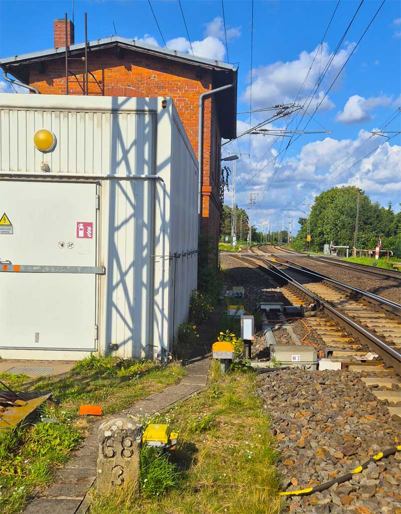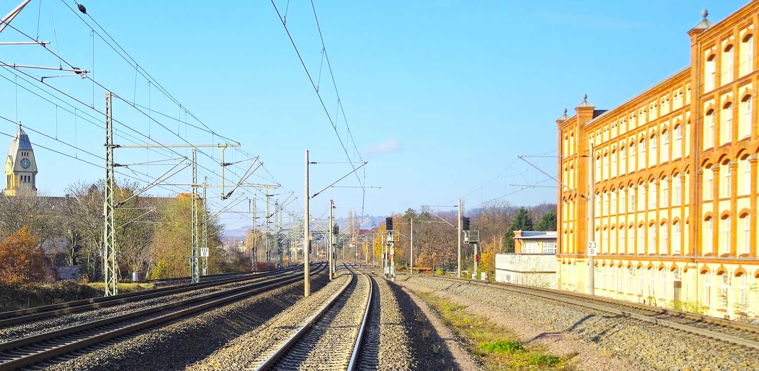 Ganz links zwei Bahnhofsgleise und links anschließend