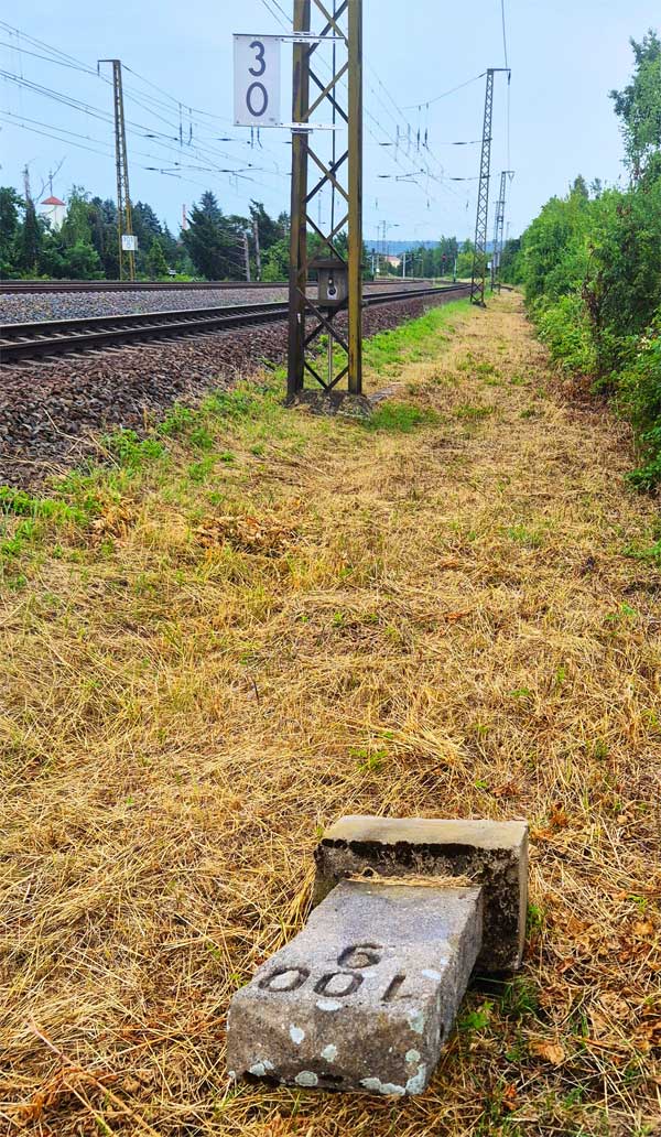 km 0,02 der Strecke Abzw. Zeithain Bogendreieck 0,02 - Elsterwerda 19,95 (ursprünglich Kilometrierung nur bis zur sächsisch-preußischen Landesgrenze km 18,264) | ||