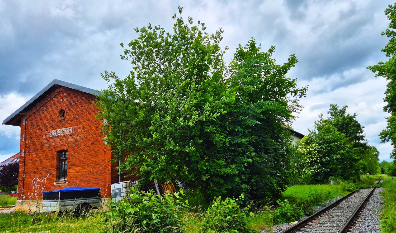 Der Kilometerstein wurde von einem anderen Fotografen und mir erst noch freigelegt, da er von meterhohen Brennnesseln und anderem Wildwuchs eingewuchert war.