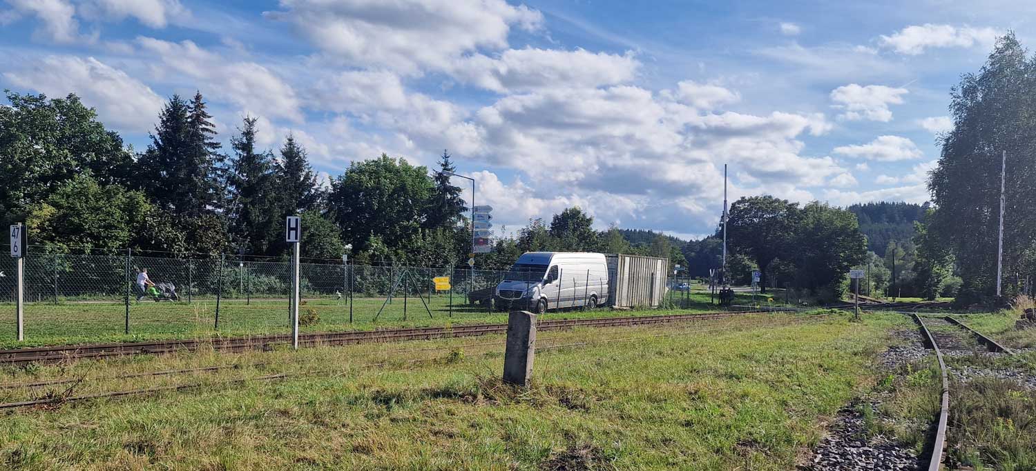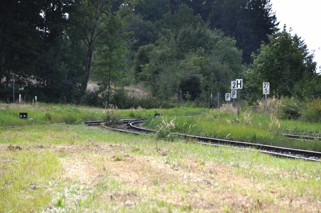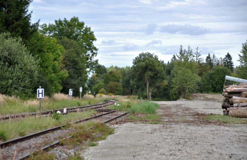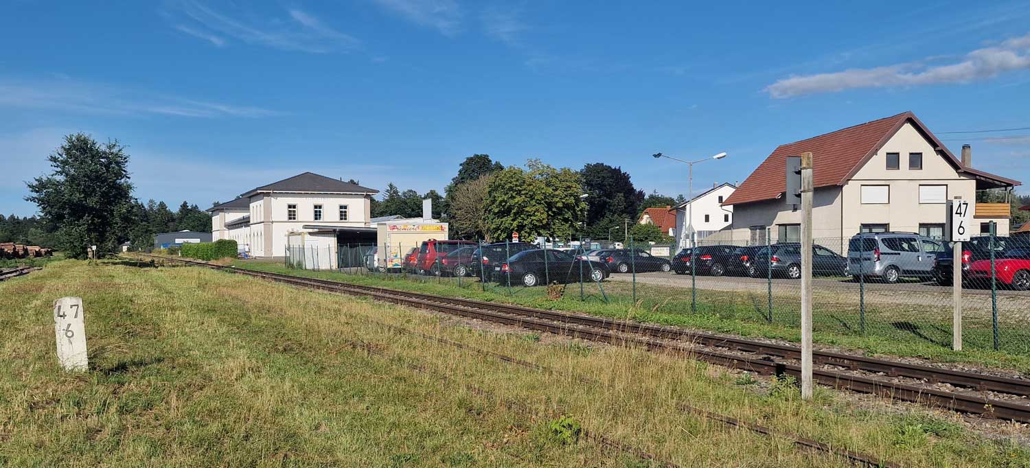 Im Hintergrund das ehemalige Bahnhofsgebäude