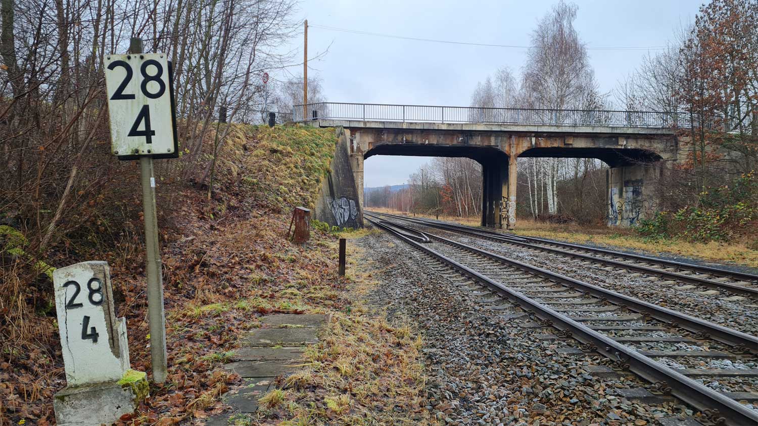 km 24,7 (Stein) und km 24,8 (Tafel und Stein) auf dem Neißeviadukt - Blick Richtung Liberec (Reichenberg)