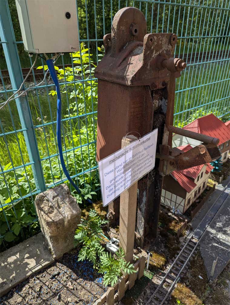 Der Stein steht im jetzigen Privatgrundstück des ehemaligen Bahnhofsgebäudes, wo der ehemalige Eisenbahner eine wundervolle und sehenswerte Gartenbahn betreibt.