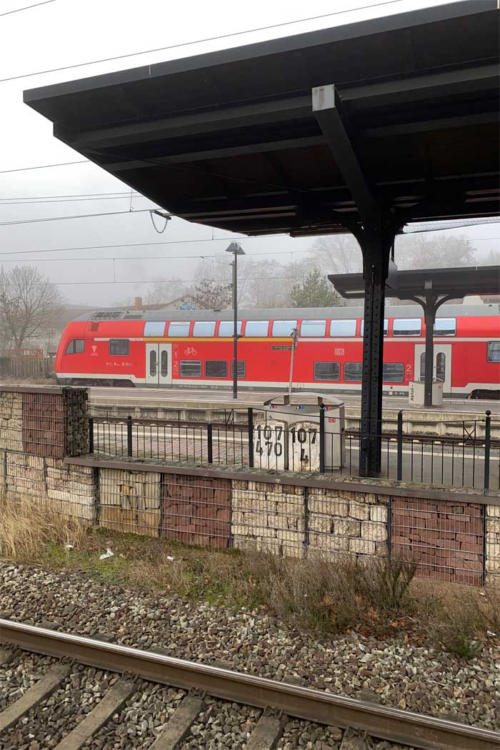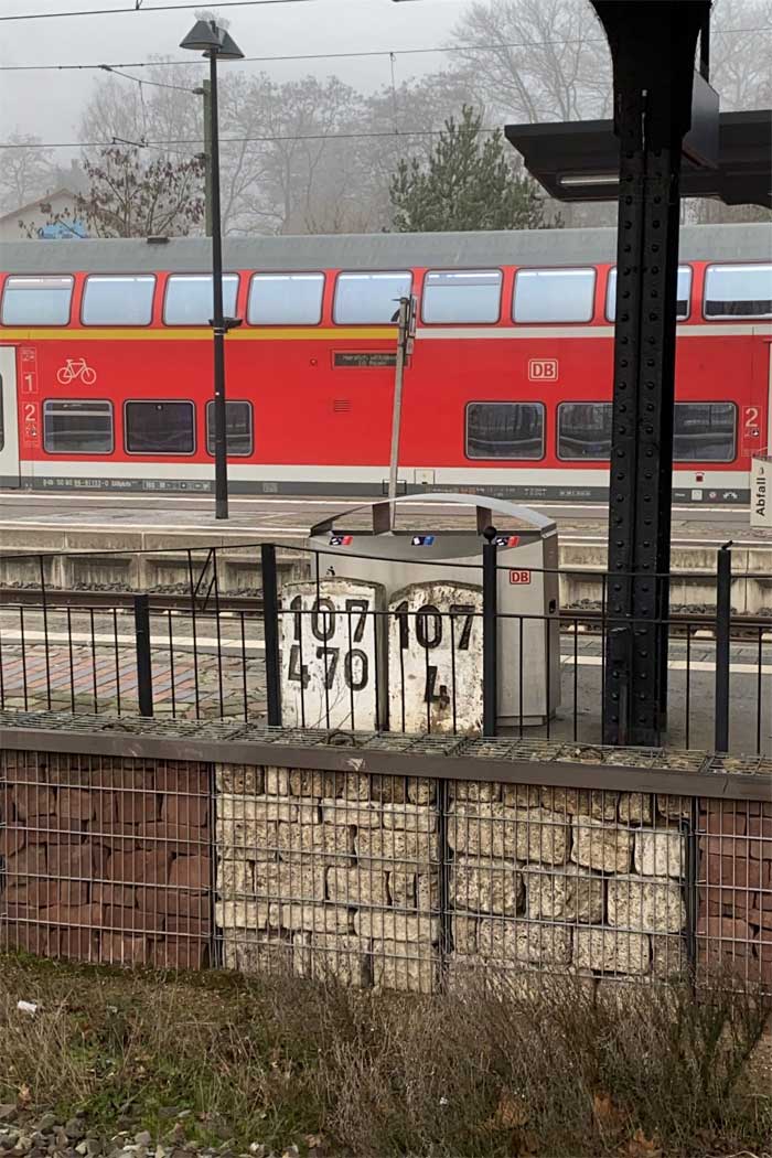 km 107,4 (Stein) und km 107,470 (Stein) am Bahnsteig