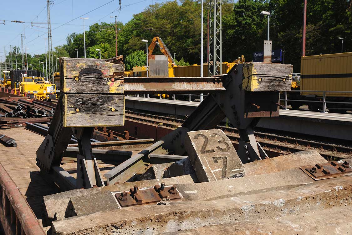 Brückenleitschienen an der EÜ Paul-Neumann-Straße. Die Brückenleitschienen verhindern, daß die Stromabnehmer an den Brückenträgern abgerissen werden. Dazu werden die Stromabnehmer von der Brückenleitschiene in Richtung Gleisachse gedrückt. Die Brücken dürften daher aus der Zeit vor der Elektrifizierung 1928 sein. Es gibt aber auch neuere Brücken mit Leitschienen. Die gelben Einrichtungen im Gleis sind Balisen des neuen, ETCS-basierten Zugbeeinflussungssystems der Berliner S-Bahn (ZBS), das die alten, mechanischen Fahrsperren ersetzt.