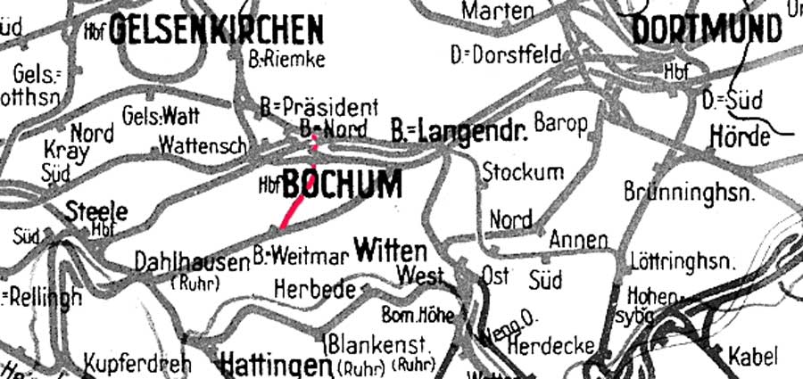 Bochum-Weitmar | 5,50 | km 12,25 der Strecke Essen-Überruhr 0,0 - Essen-Steele 2,27 - Bochum-Dahlhausen 7,00 - Bochum-Weitmar 12,25 - Bochum-Langendreer 21,44 |