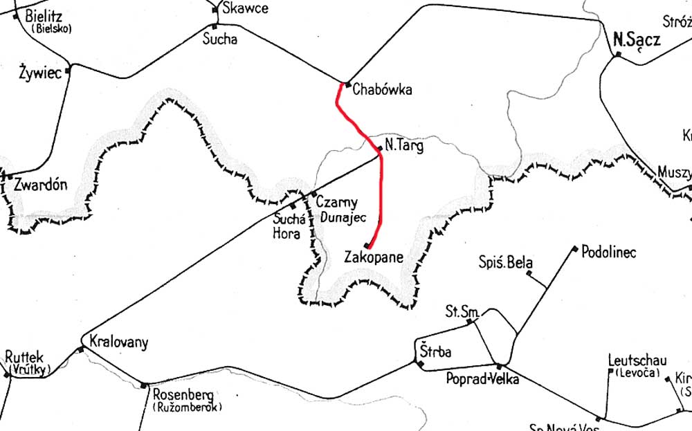Neumarkt (Dunajec) | 22,575 | km 0,0 der Strecke Neumarkt (Dunajec) 0,0 - Podczerwone 18,015 - Grenze Ostbahn/Slovakai - Sucha Hora 70,030 - Kraľovany 0,102 |