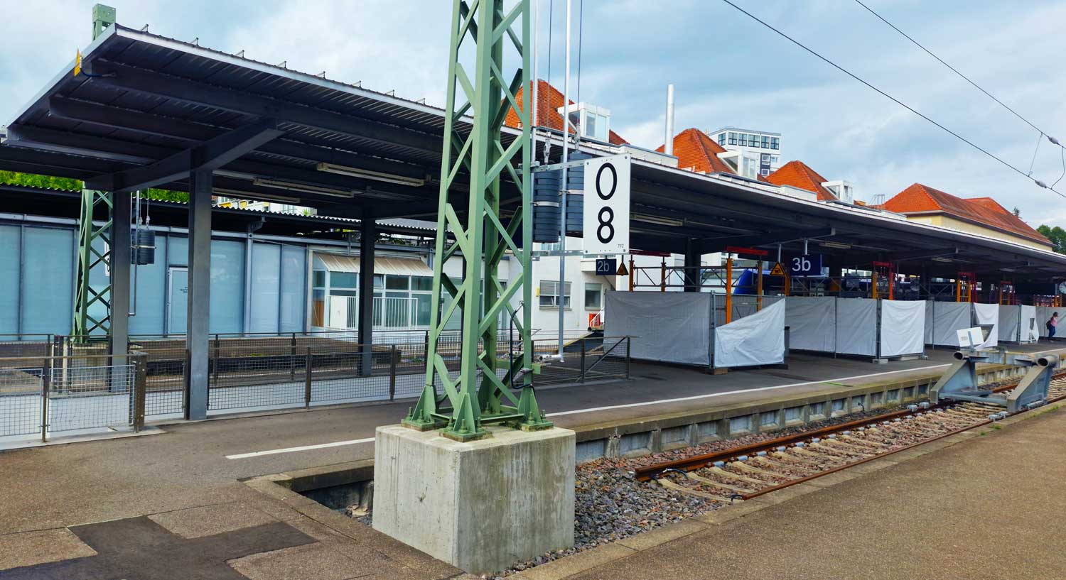 km 0,0 der Strecke Friedrichshafen Stadt 0,0 - Abzw Lindau-Aeschach 22,55 | ||