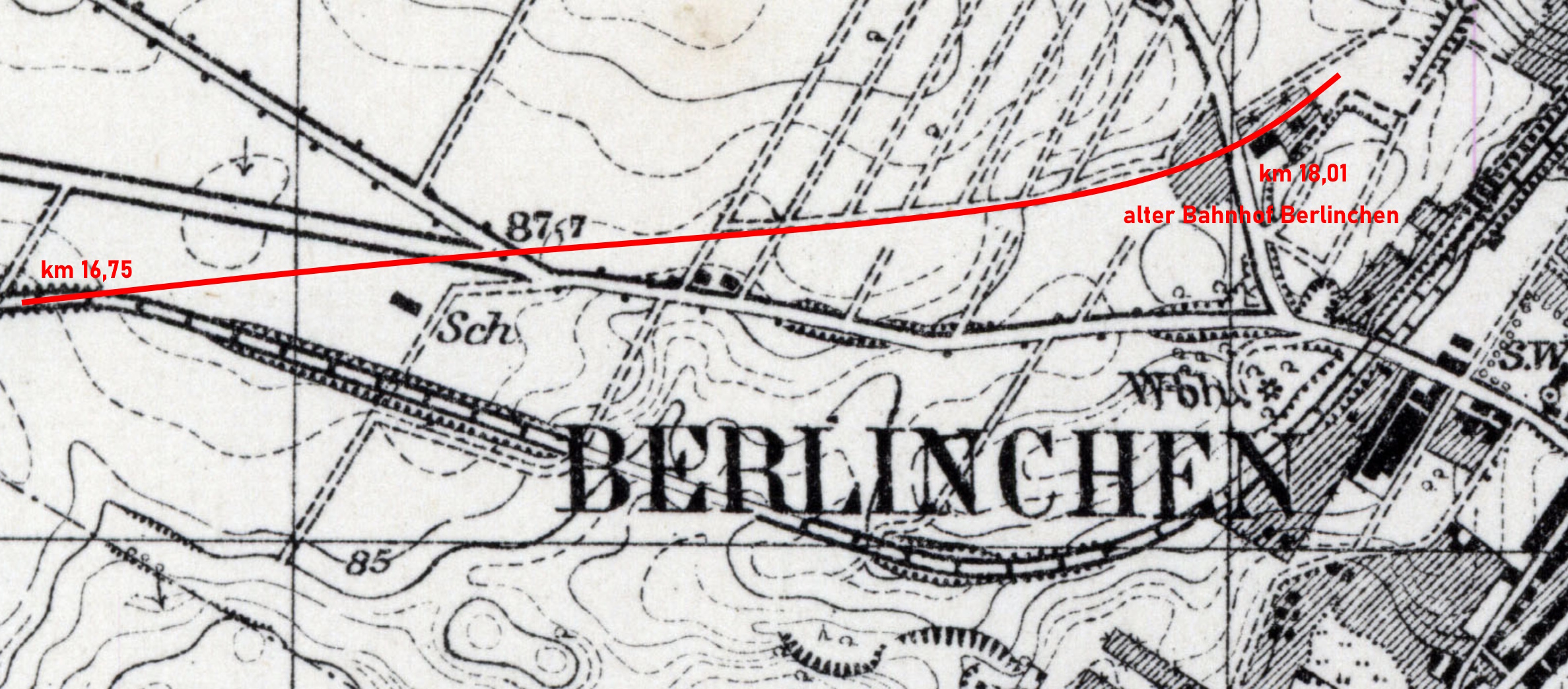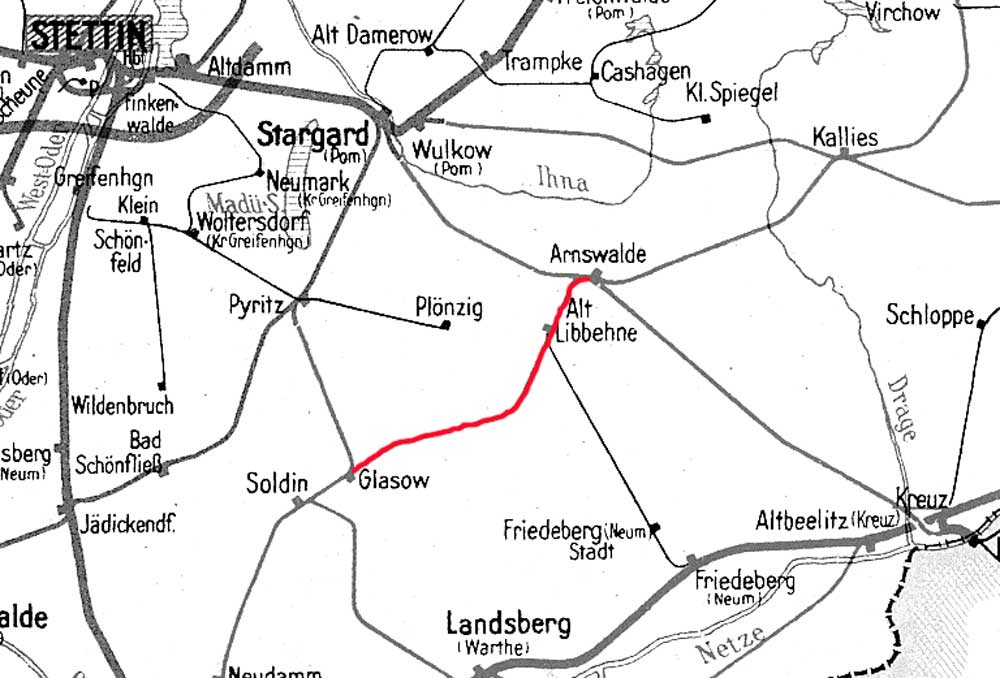 18,01 km eröffnet. Am 01.04.1892 wurde die Bahngesellschaft durch die Stargard-Cüstriner Eisenbahn erworben. Beim Weiterbau der Strecke von Berlinchen nach Arnswalde wurde ab km 16,75 eine neue Linienführung gewählt und am km 19,35 ein neuer Bahnhof in Berlinchen angelegt. Die neue Strecke ging am 07.08.1898 in Betrieb. Die Strecke von km 16,75 bis zum alten Bahnhof am km 18,01 wurde am 01.04.1898 eingestellt und abgebaut. |