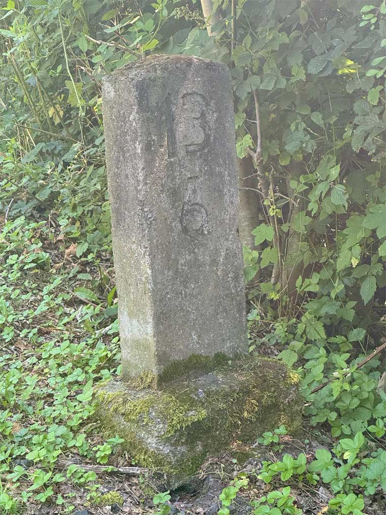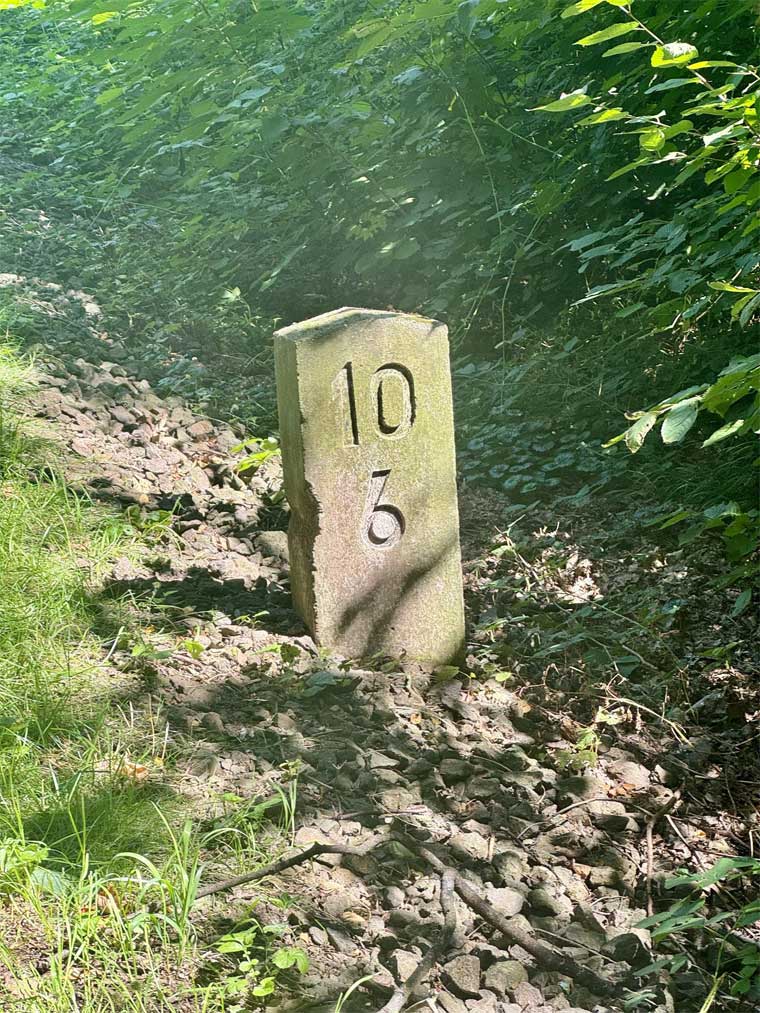 Im Hintergrund rechts ist schemenhaft km-Stein 1,6 zu erahnen.