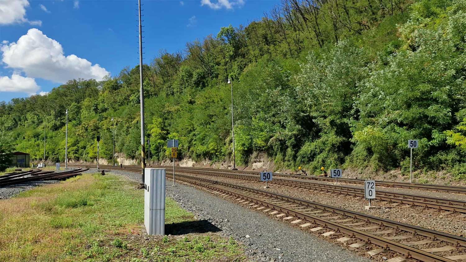 km 29,3 in Mladá Boleslav hlavní nádraží (Jungbunzlau Hauptbahnhof / Mladá Boleslav hlavní nádraží) - Blick Richtung Nymburk hlavní nádraží [Neuenburg (Elbe) / Nymburk]