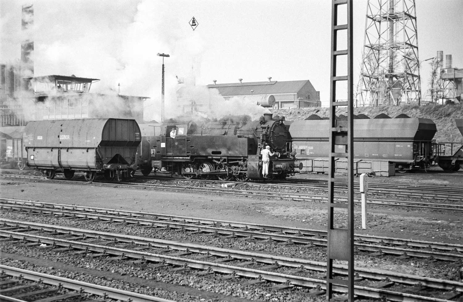 Am 30. April 1984 röhrten 212 105 und 212 069 (rot) mit einem Kohlezug aus Siersdorf durch den schon von Rückbaumaßnahmen der Bundesbahn gezeichneten Merksteiner Güterbahnhof, der gelegentlich nach einer anderen, bereits vergangenen Grube auch „Bahnhof Nordstern“ genannt wurde.