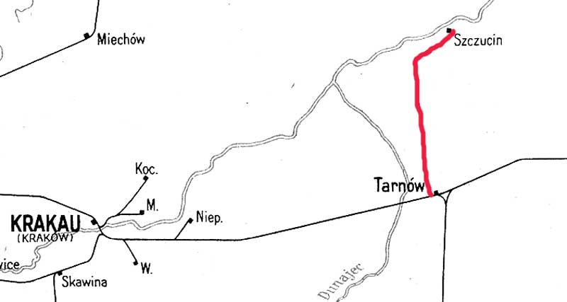 Tarnow 0,0 - Szczucin 48,777 - OBD Grenze 49,109 // Szczucin Schmalspurbahnhof 135,95 - Zborowek 124,02 - Bogoria 84,26 - Hajdaszek 23,01 - Jedrzejow Schmalspurbahnhof 0,0
