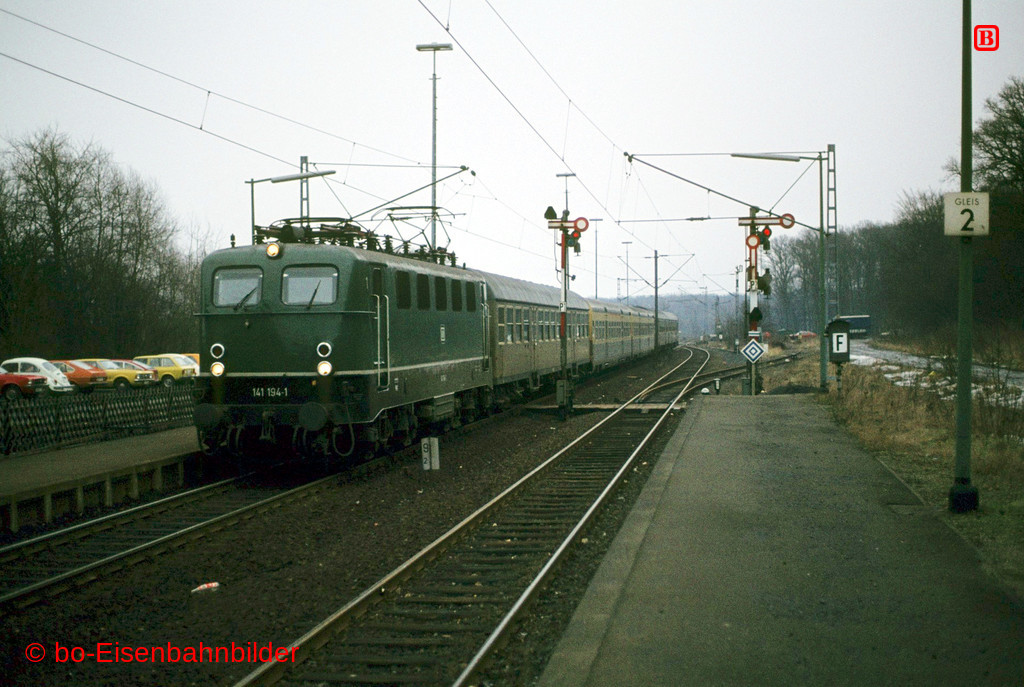 Egestorf (Deister), km-Schild 9,2 zwischen den Gleisen - 141 194 fährt am 14.03.1979 mit N4826 in Egestorf (Deister) ein.