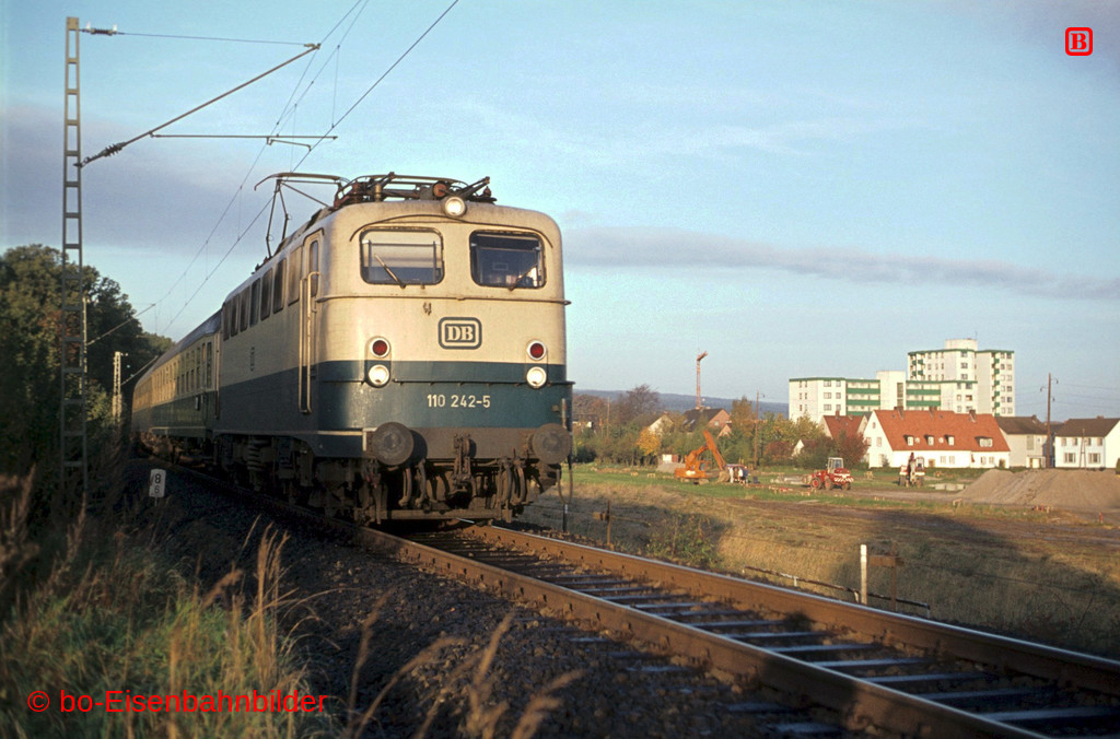 Ausfahrt Egestorf (Deister) in Richtung Hannover, km-Stein 8,6 - 110 242 am 19.10.1979 mit dem Berufsverstärker N4813 kurz hinter der noch eingleisigen Ostausfahrt von Egestorf (Deister).