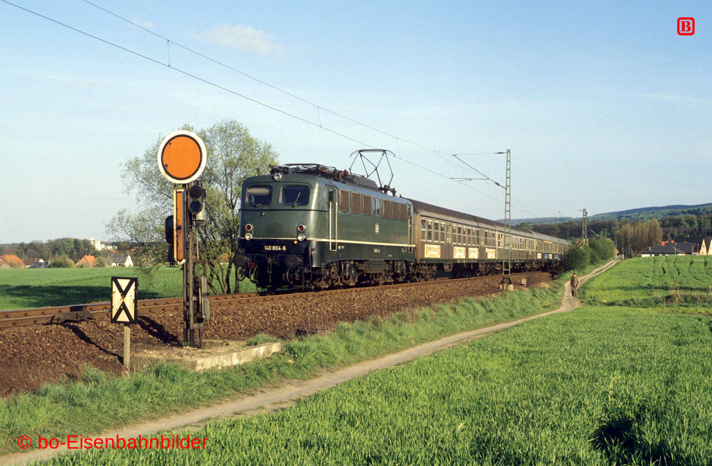 zwischen Egestorf (Deister) und Kirchdorf (Deister), km-Stein 10,8 - mit N4836 steht die zum Aufnahmezeitpunkt in Oberhausen Osterfeld Süd beheimatete 140 804 am 09.05.1980 in Wendezugdiensten auf der Deisterstrecke Richtung Haste zwischen Egestorf und Kirchdorf und passiert in Kürze das Einfahrvorsignal von Egestorf.