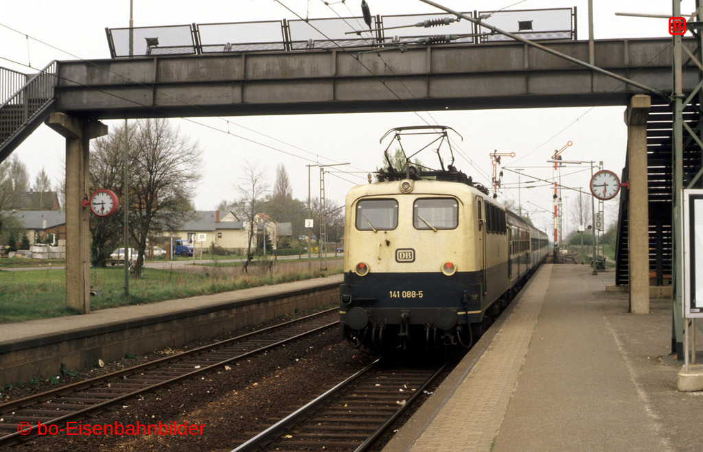 Wennigsen (Deister) noch mit Formsignalen, km-Schild 5,0 am Gittermast - 141 088 schiebt ihren aus einem Prototyp-Bn und LHB-Prototyp-Wagen bestehenden Wendezug N4839 am 21.04.1988 aus dem Bahnhof Wennigsen (Deister) in Richtung Hannover.
