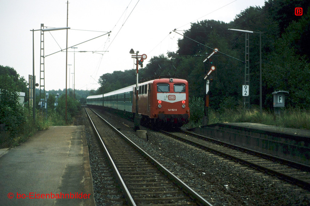 Egestorf (Deister), km-Schild 9,2 am Gittermast - 141 152 verlässt am 12.08.1989 mit CB4841 den Bahnhof Egestorf (Deister) in Richtung Hannover.