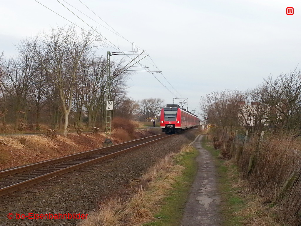 zwischen Egestorf (Deister) und Kirchdorf (Deister), km-Schild 10,6 am Gittermast - 424 028 hat am 07.03.2015 den Haltepunkt Kirchdorf (Deister) verlassen und ist als S2 auf dem Weg nach Hannover.