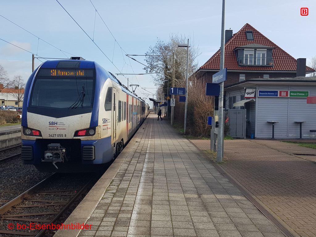 Wennigsen (Deister) inzwischen zur S-Bahn-Sation umgebaut, km-Schild 5,0 am Betonmast - 3427 055 B eingesetzt auf der S1 am 20.02.2024 im baustellenbedingten Wendebahnhof Wennigsen (Deister).