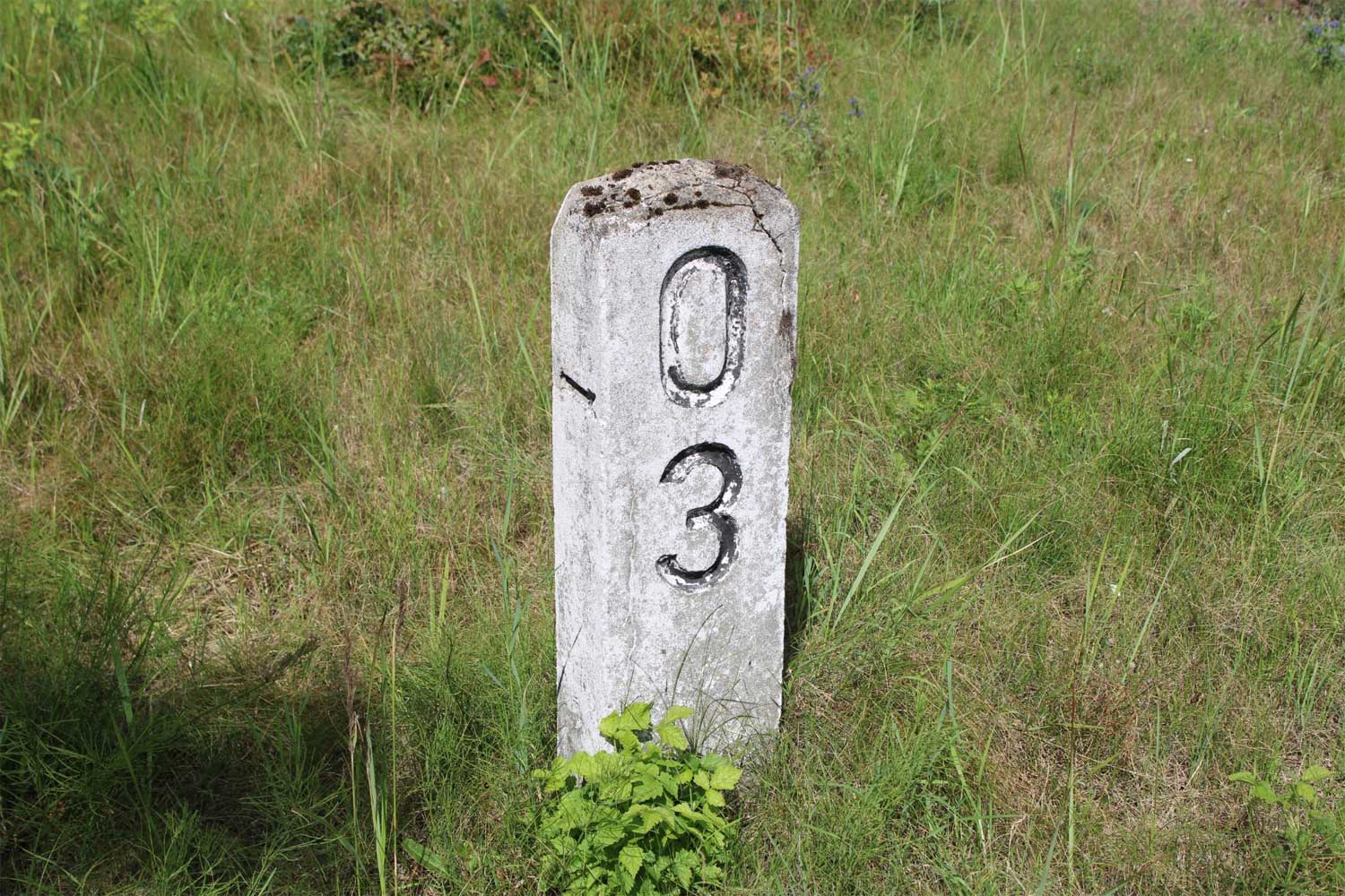 km 19,4 (Tafel); km 19,5 (Stein); km 19,6 (Tafel) und km 19,7 (Stein) in Thießen
