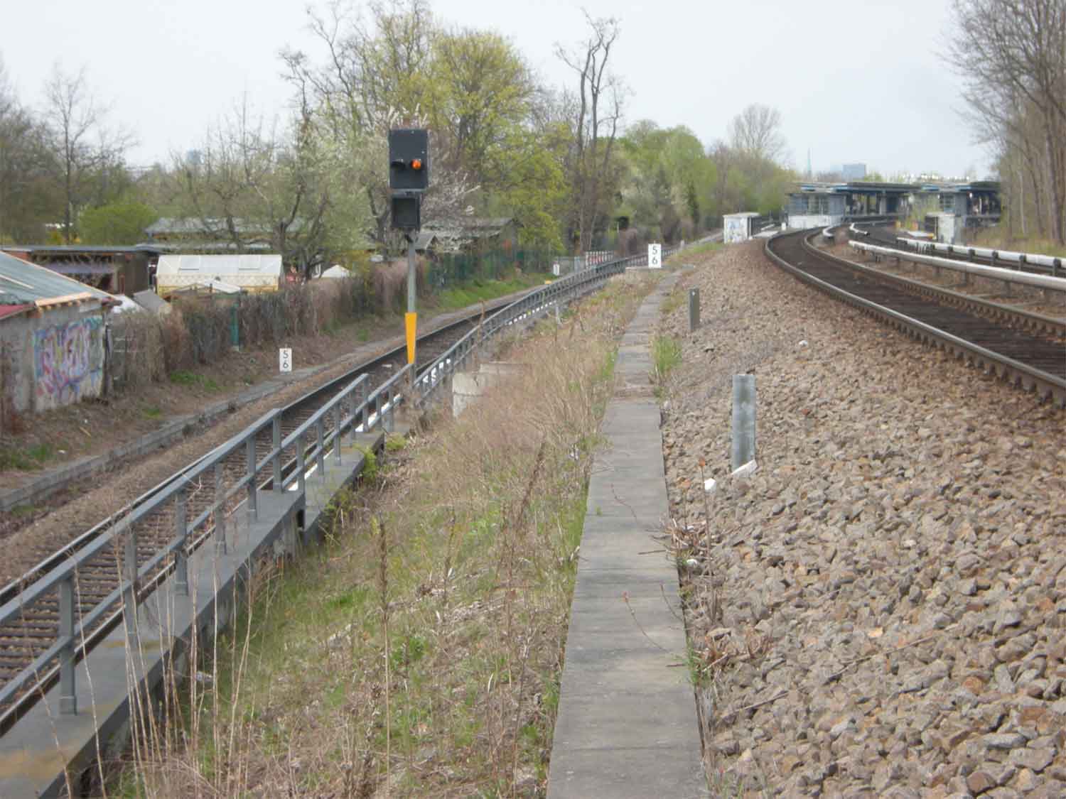km 5,6 (Richtungsgleis, links unten) in Berlin Priesterweg - Blick Richtung Berlin