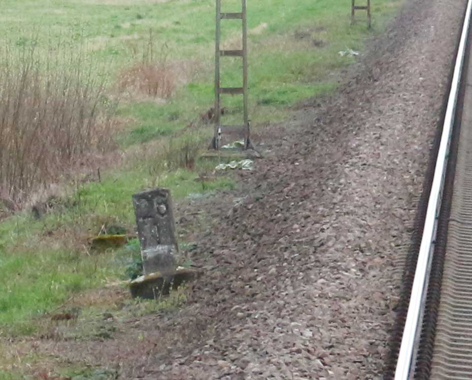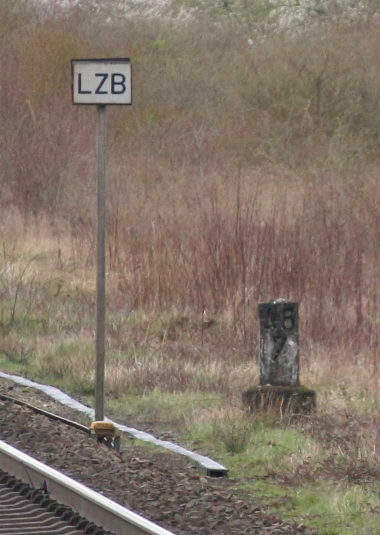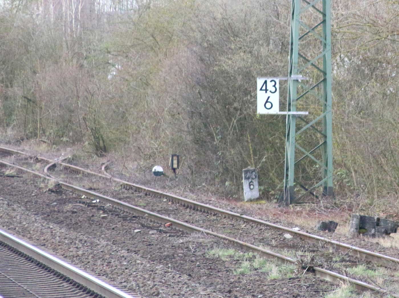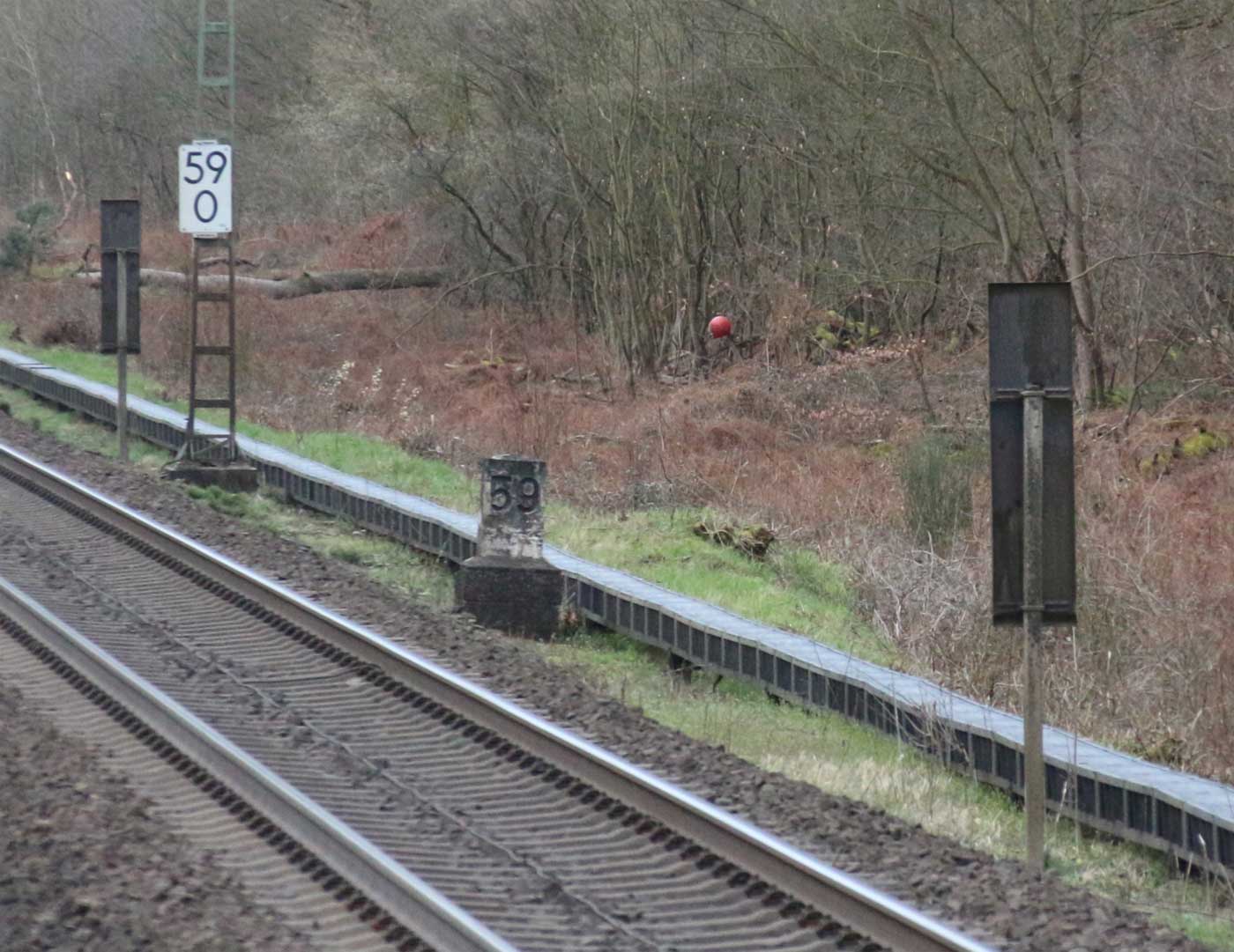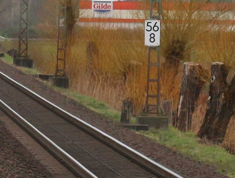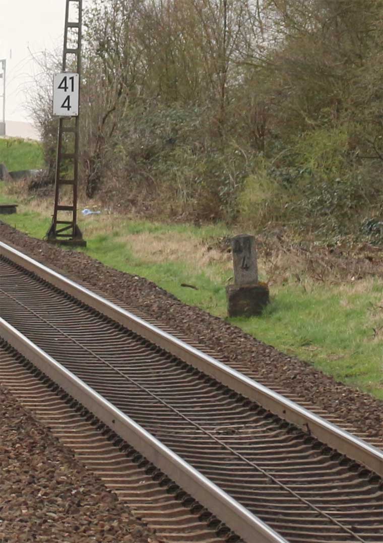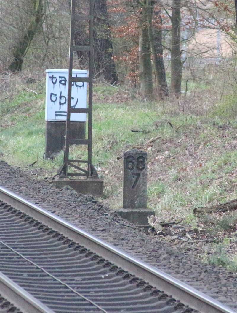 km 20,0 (verschmutzte Tafel in Bildmitte) gehört zum Streckenast der Strecke