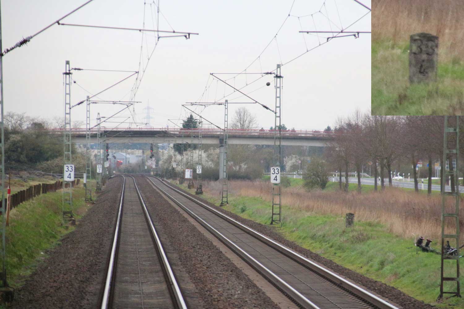 km 27,8 (Stein und Tafel) in Biblis - Blick Richtung Frankfurt (Main)