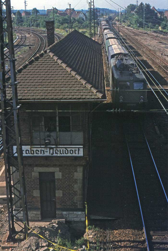 Links am Bahnsteigende km 96,6 der Strecke Mannheim Hbf 0,0 - Heidelberg Hbf (alt) 18,2 (neu) 17,4 = 19,1 - Karlsruhe Hbf 72,90 - Basel Bad. Bf 270,69 - Singen (Hoh) 384,08 - Konstanz 414,34 - Staatsgrenze 414,83