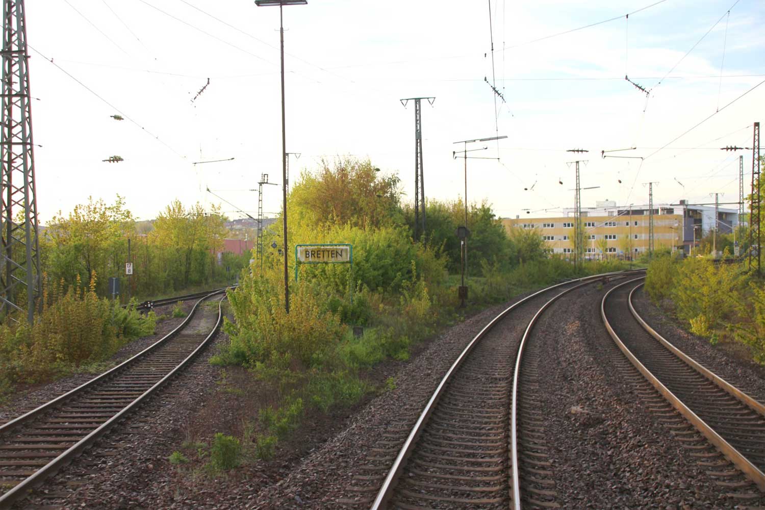 Bretten | 14,92 | km 17,18 der Strecke Grötzingen -0,01 - Bretten 17,18 - Eppingen 40,76 - Kilometerwechsel km 41,949 = (km 141,500 - Heilbronn Hbf 118,60 - Schwäbisch Hall-Hessental 57,67 - Crailsheim 30,45 - Goldshöfe 0,0) (siehe auch Tabelle 3, Ziffer 4) |