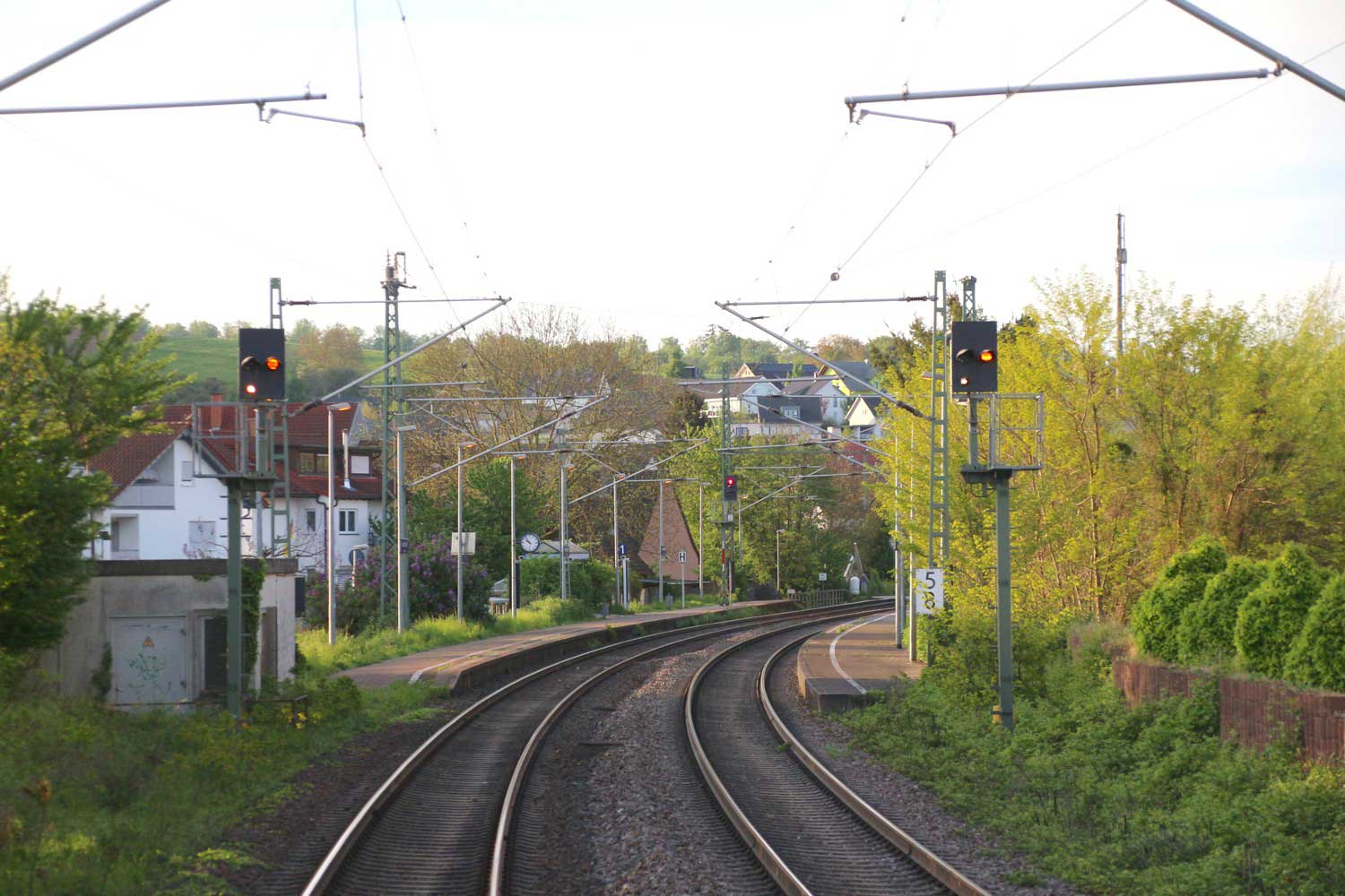 km 0,96 der Strecke Bruchsal -0,83 - Bretten 14,92 - ehemalige Landesgrenze Baden/Württemberg 16,027 = [km 62,496 - Bietigheim-Bissingen 23,57 - Stuttgart Hbf 0,02] (4130) | ||