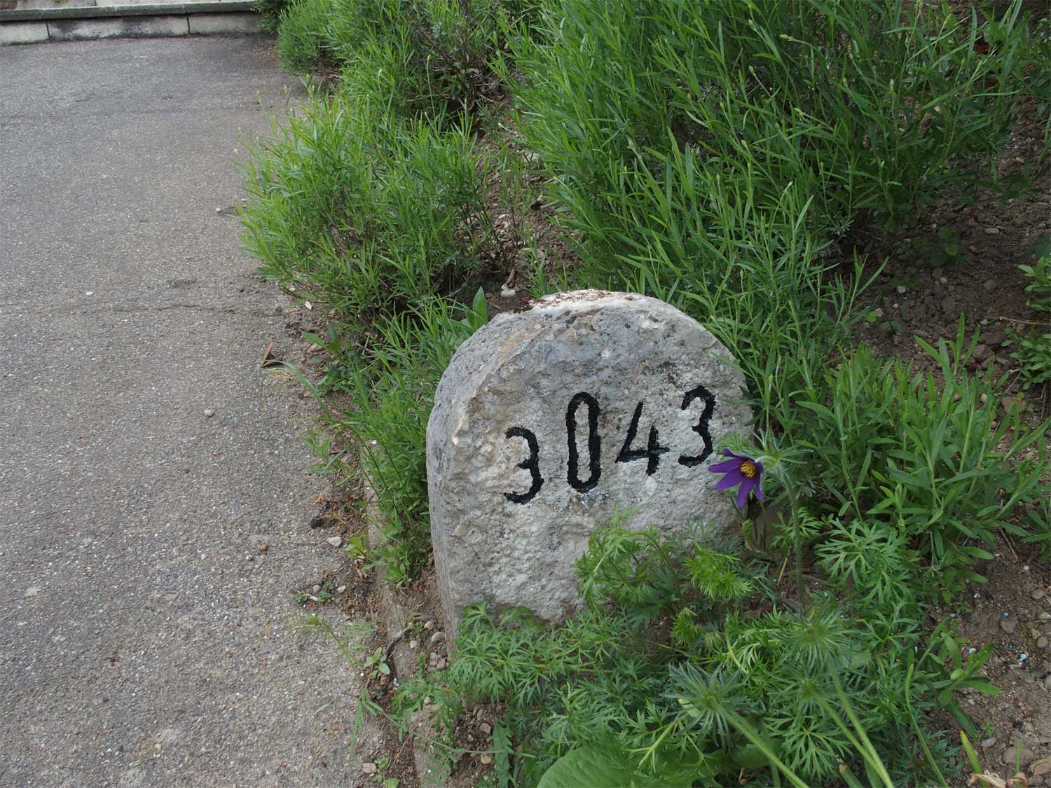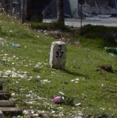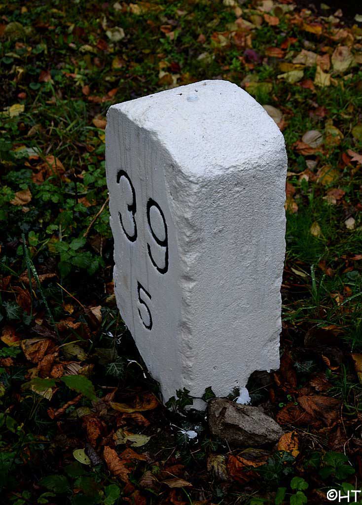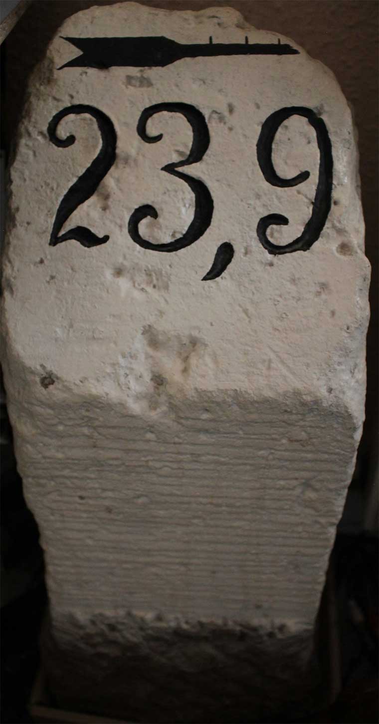 Der Stein zeigte eigentlich 23,5. Er wurde wahrscheinlich wiederverwendet bei km 3,5 und die 2 wurde unkenntlich gemacht.
