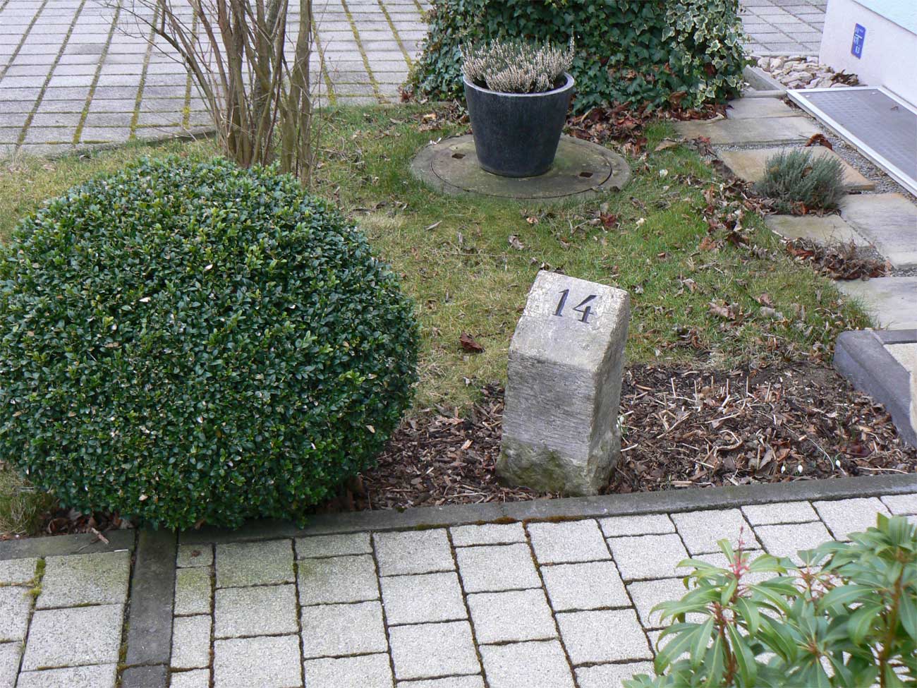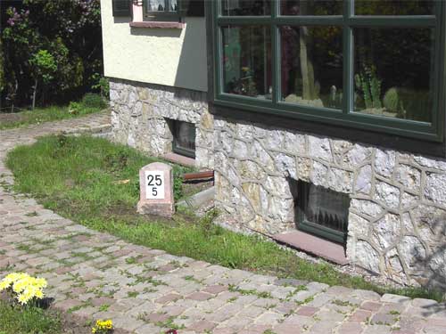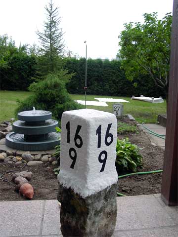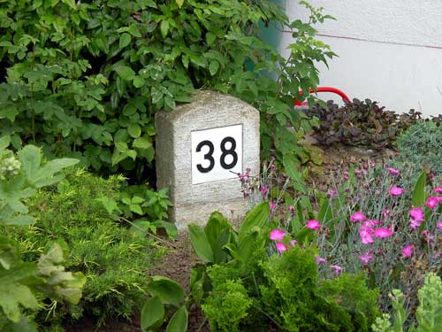 km-Stein im Vorgarten eines Eisenbahnfreundes in Erfurt. Er stellt die Hausnummer dar. (Juli 2004) |