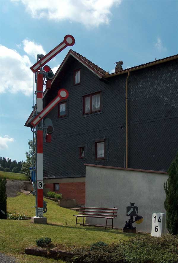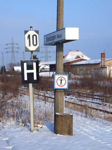 Bf Breitungen (Werra) Unzulässiges Signal über der H-Tafel Das Signal über der H-Tafel (So 8) ist nicht im Signalbuch DV 301 zu finden. Es soll wohl eine neue Kreation der DB AG darstellen (Kombination aus Signal Lf 5 und Lf 7). Wahrscheinlich sollten aber nur Kosten gespart werden. Hoffentlich weis der Lok- oder Triebfahrzeugführer bescheid. (Foto: Steffen Dietsch, Dezember 2005)