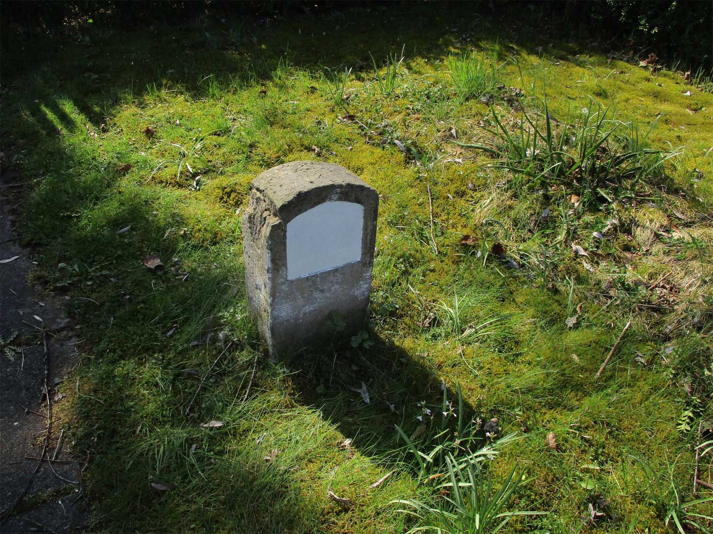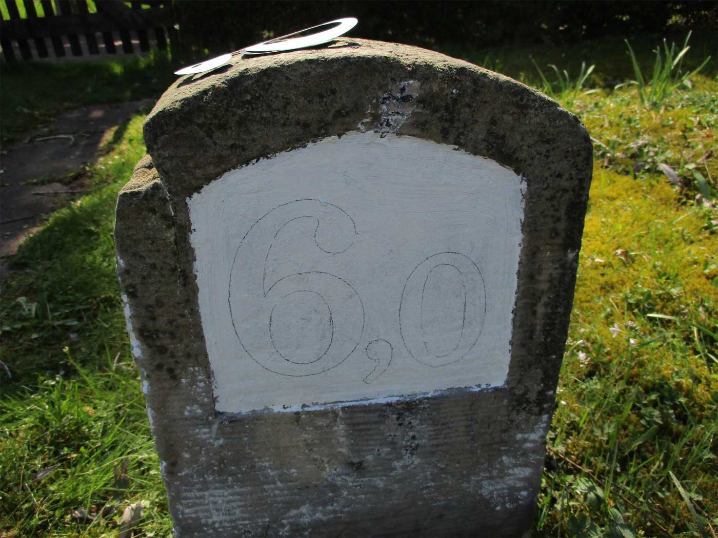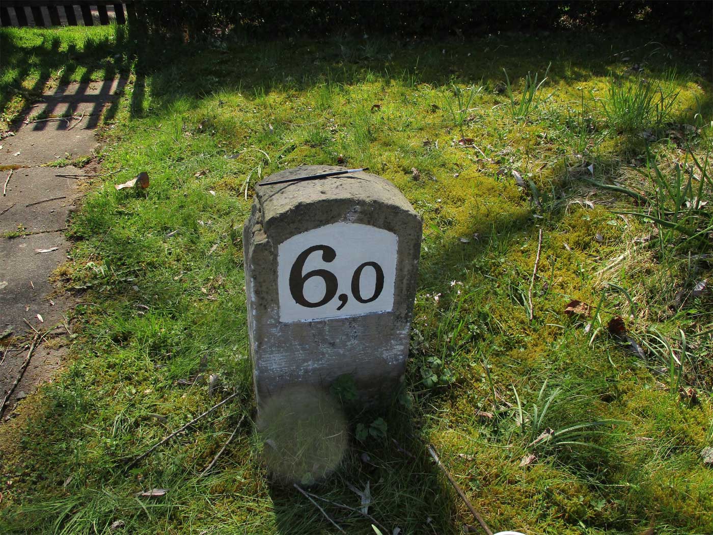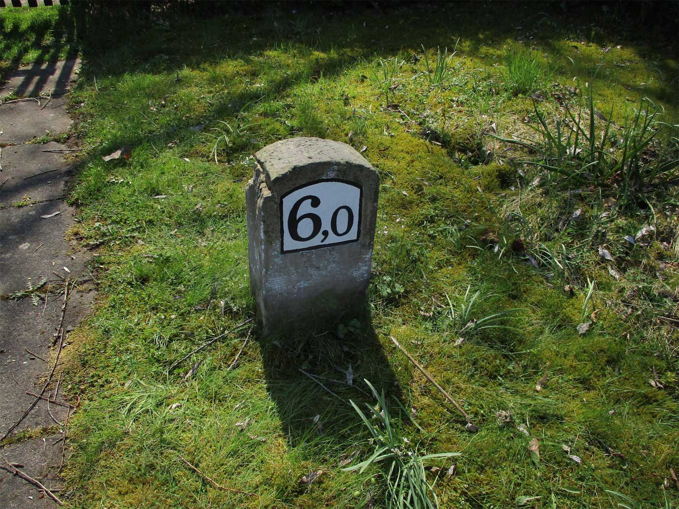 Kilometerstein 3,3. Beachtenswert ist das Schriftfeld aus Porzellan im Betonstein.