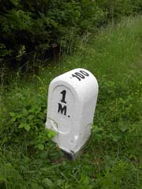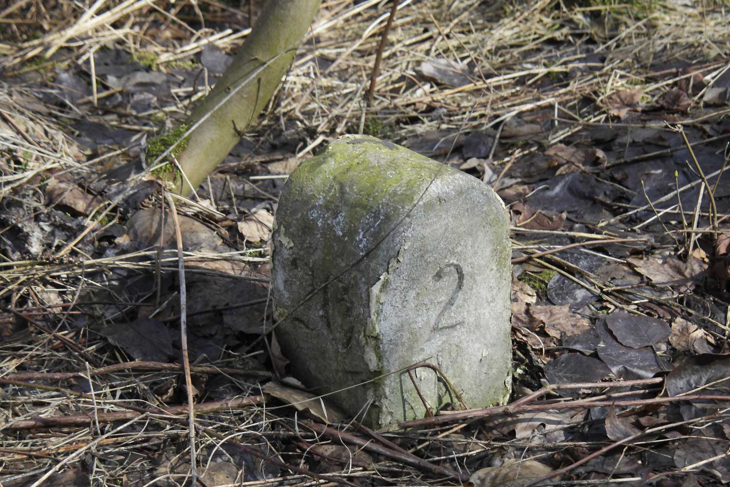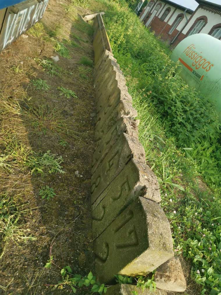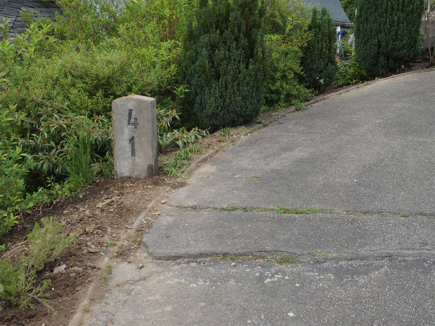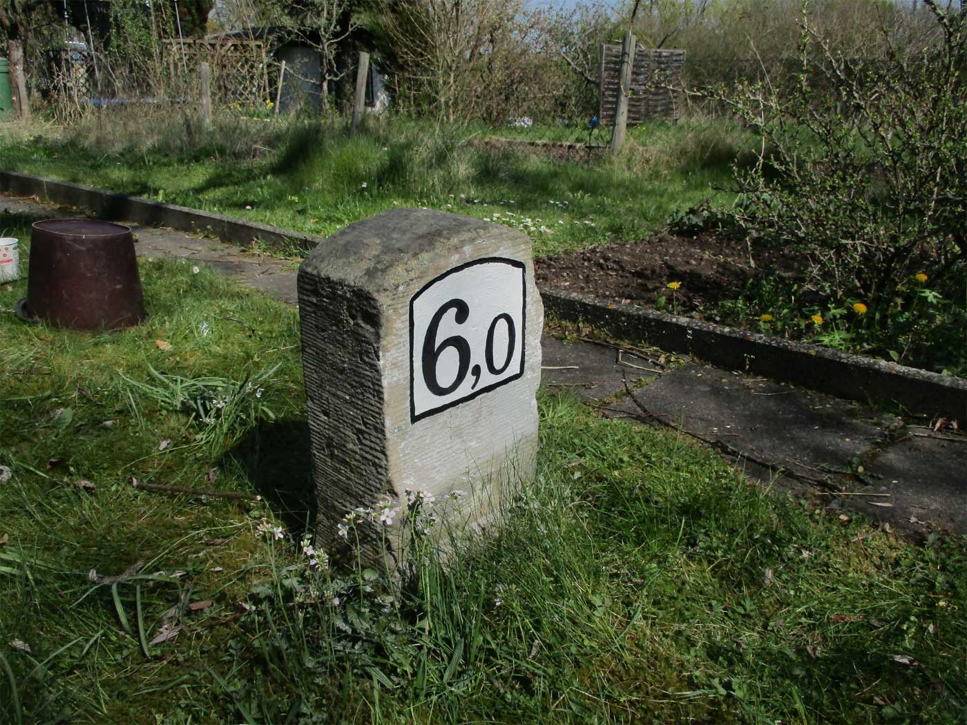 Kilometerstein 3,3. Beachtenswert ist das Schriftfeld aus Porzellan im Betonstein.