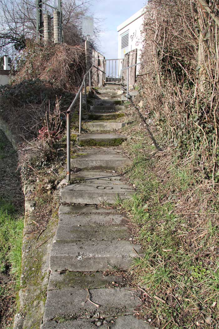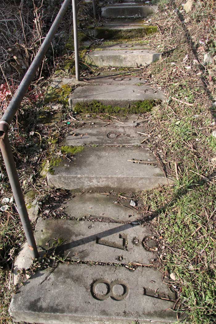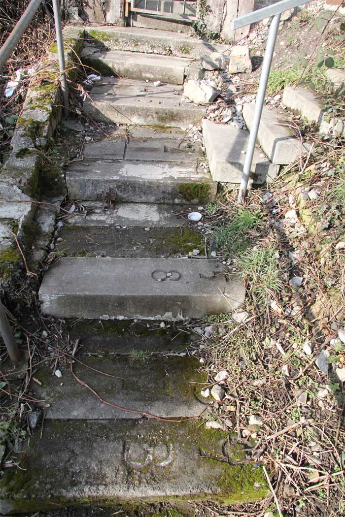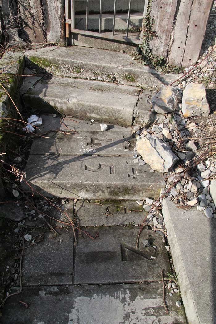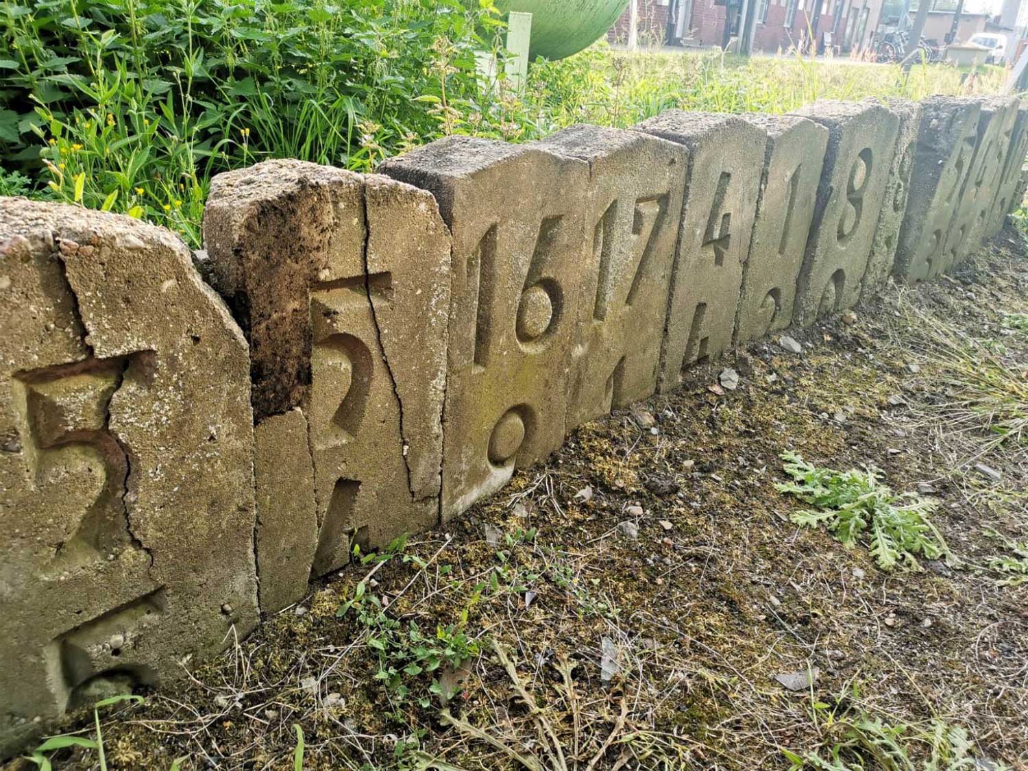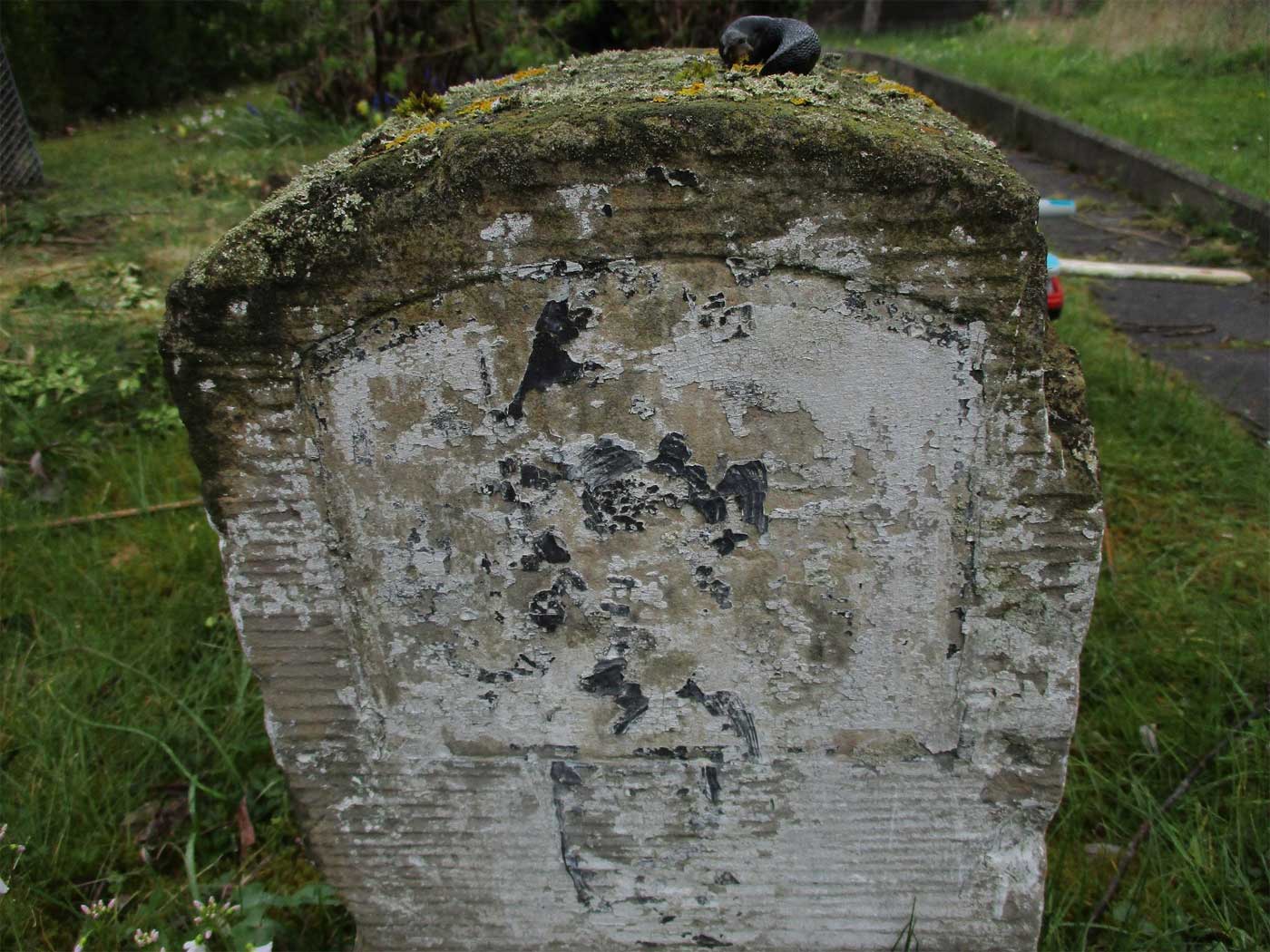 Kilometerstein 3,3. Beachtenswert ist das Schriftfeld aus Porzellan im Betonstein.