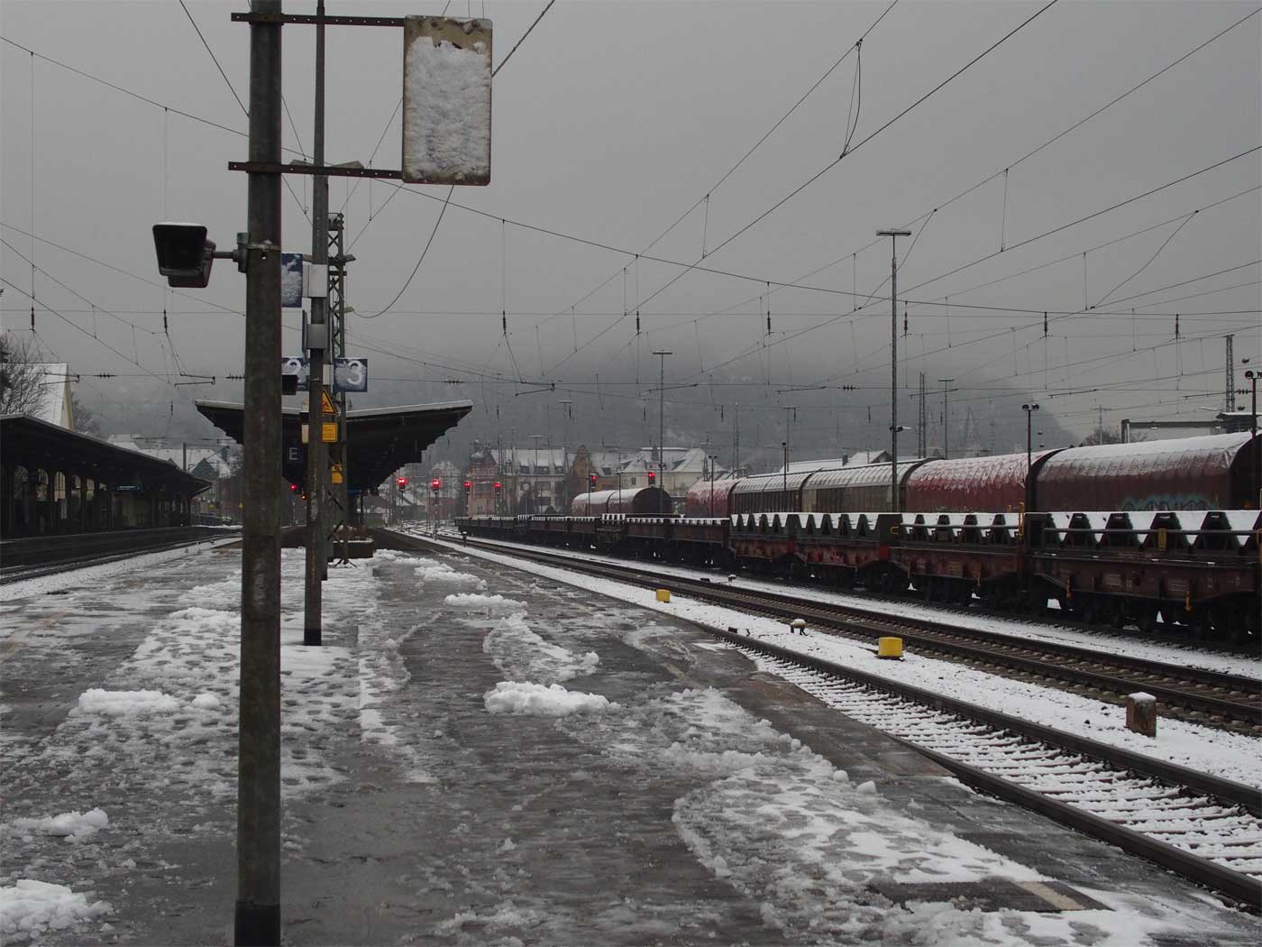 | Andernach | -0,20 | km 73,24 der Strecke Köln Hbf -2,01 - Koblenz Hbf 91,20 - Bingen (Rhein) Hbf 152,00 - ehemalige Landesgrenze Preußen/Hessen (Mitte Nahebrücke) km 152,41 [= km 0,0 - Bingen (Rhein) Stadt 0,97 - Mainz Hbf 30,59] (siehe auch Tabelle 4, Ziffer 4) (2630/3510)) |