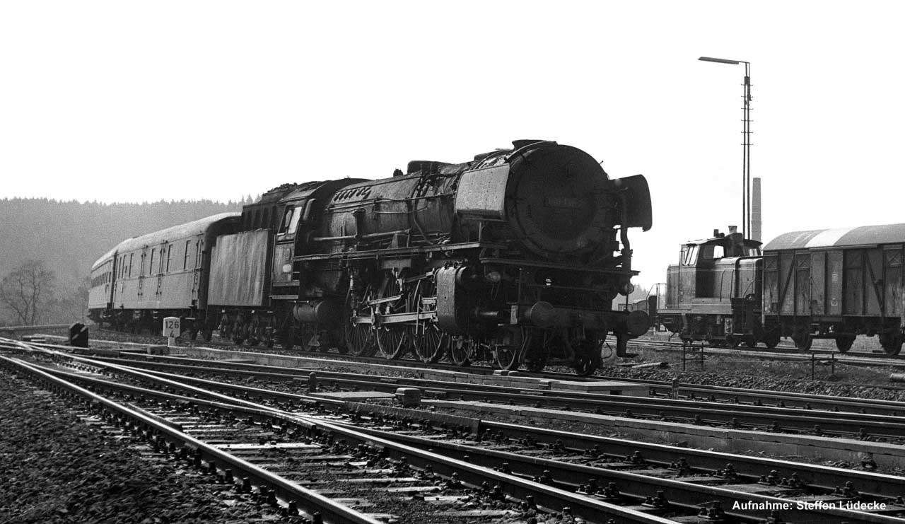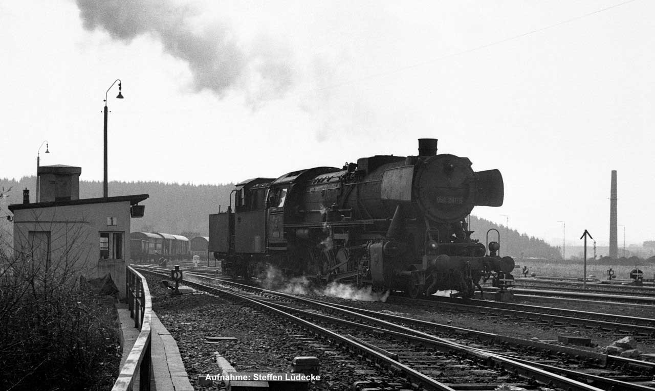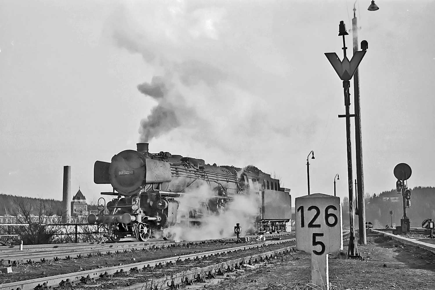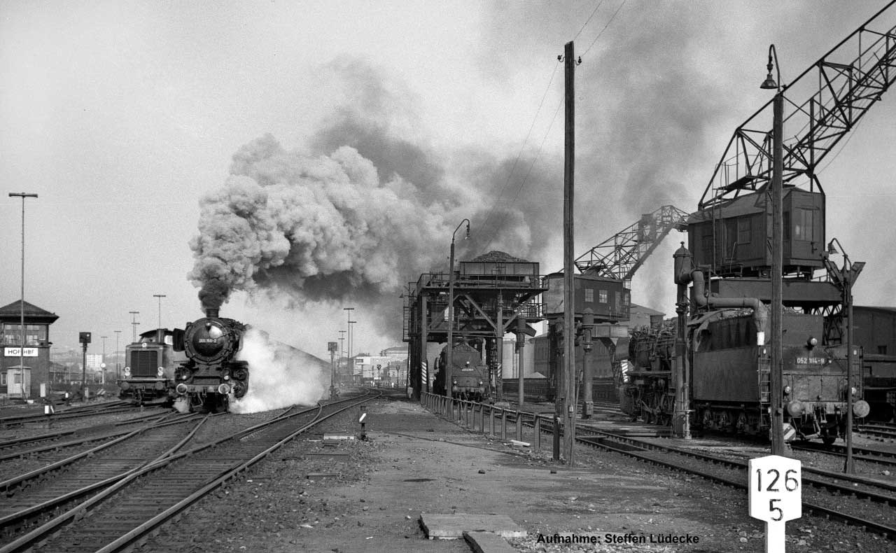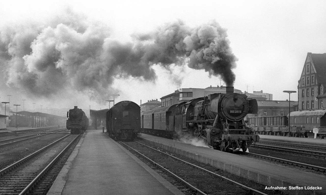 Drei Dampfloks hatten in Hof Hbf ihre Personenzüge am Haken: 050 281 fuhr mit dem N 3285 (Hof 17.10 Uhr – Schwandorf 19.51 Uhr) gerade aus,