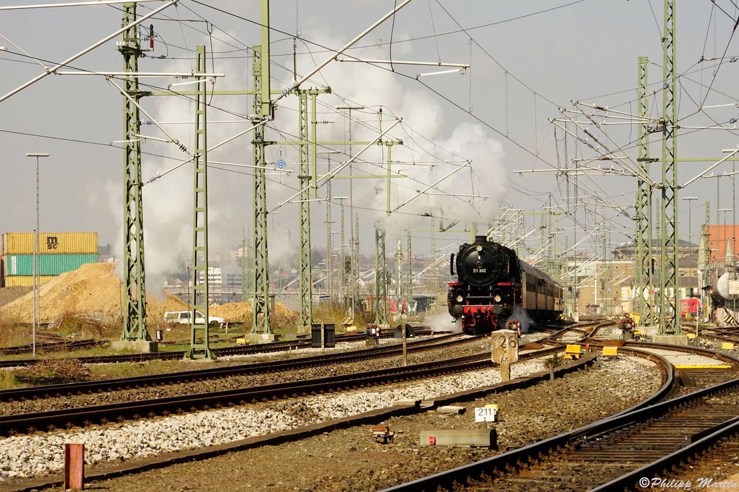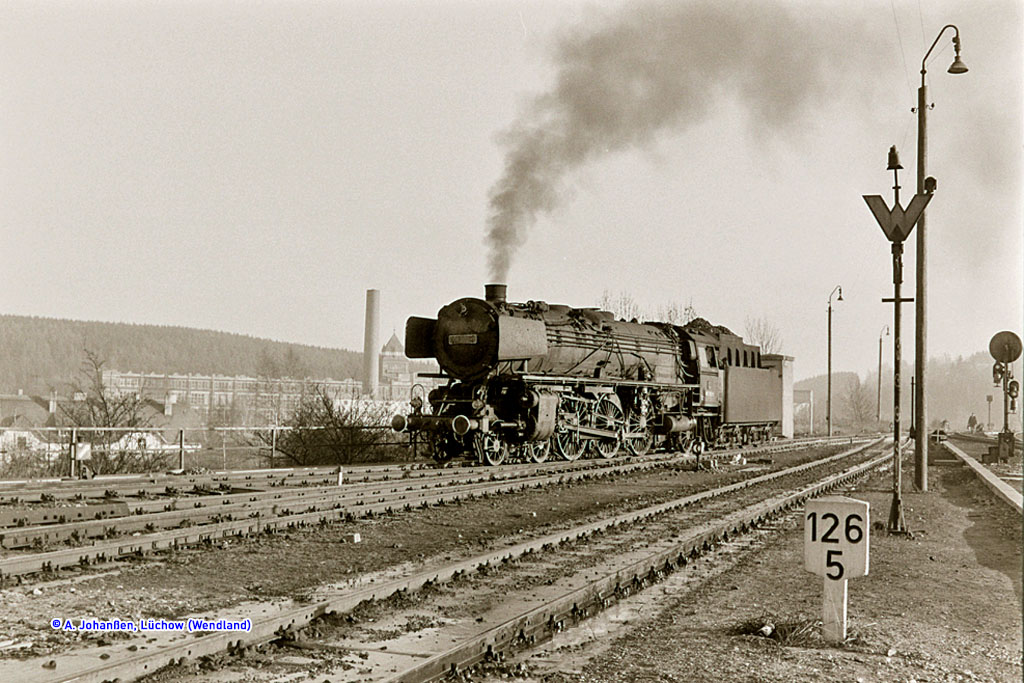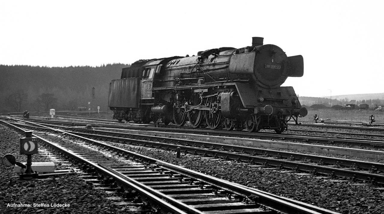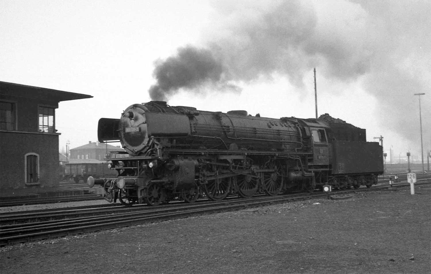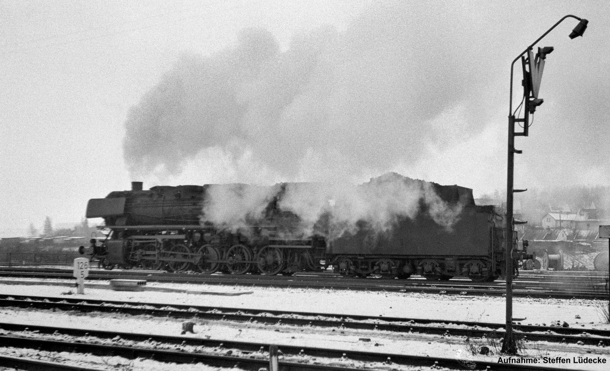 Drei Dampfloks hatten in Hof Hbf ihre Personenzüge am Haken: 050 281 fuhr mit dem N 3285 (Hof 17.10 Uhr – Schwandorf 19.51 Uhr) gerade aus,
