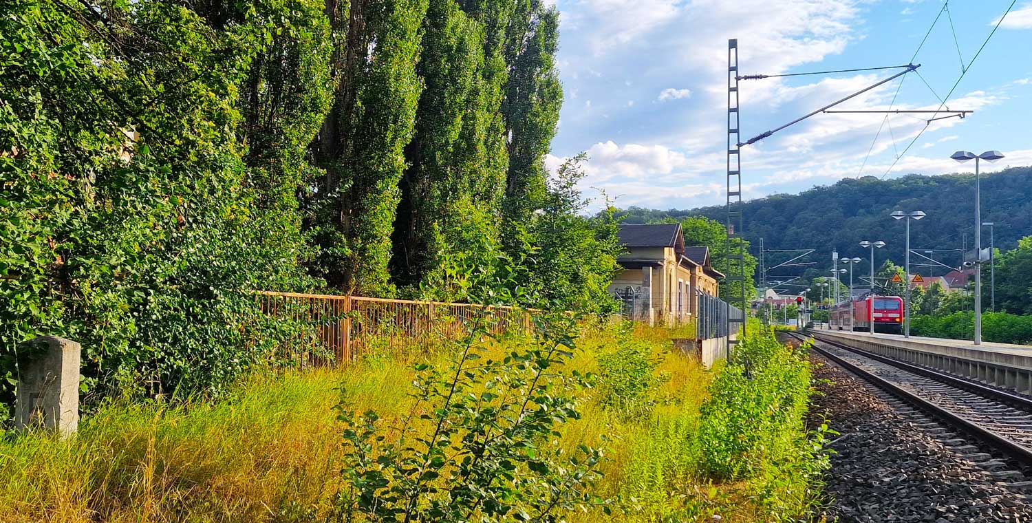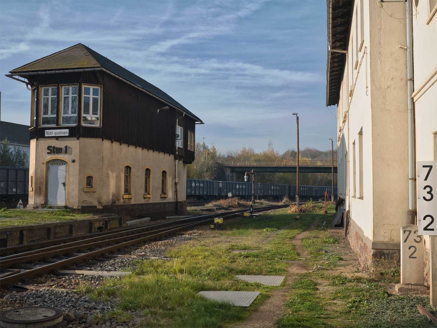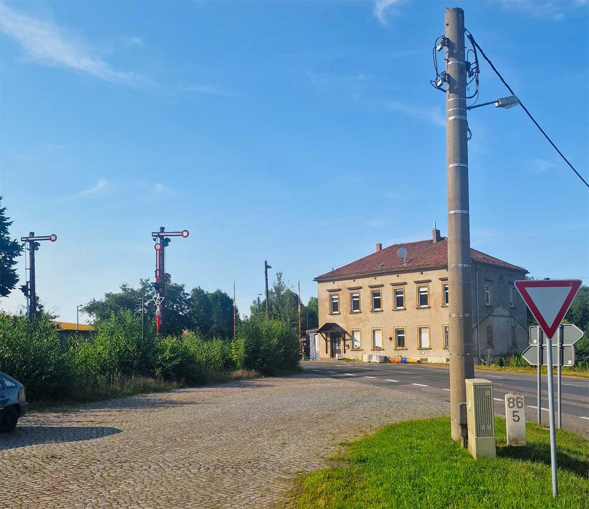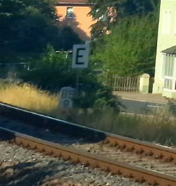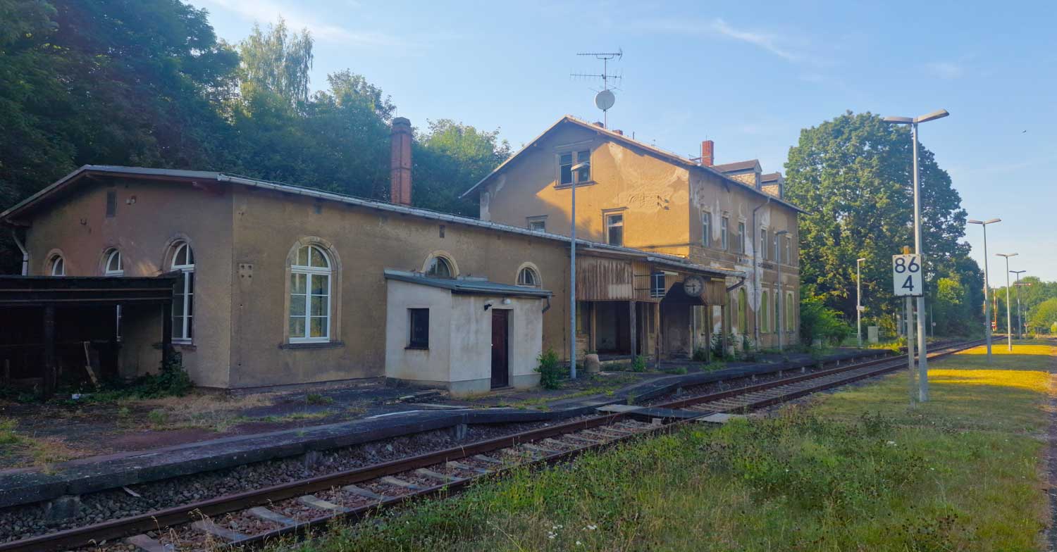 Man beachte auch die schiefstehende Lampe vor dem Bahnhofsgebäude.