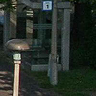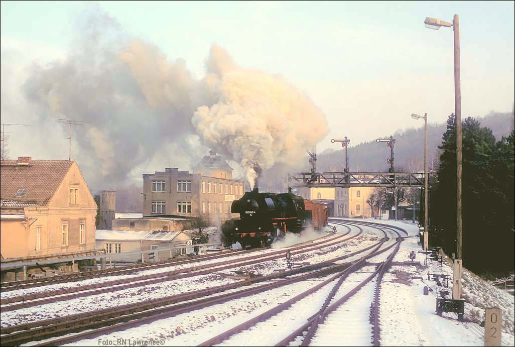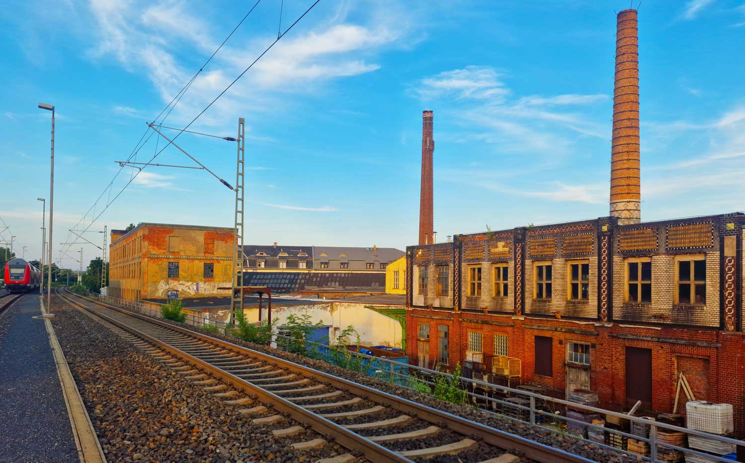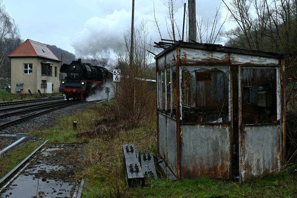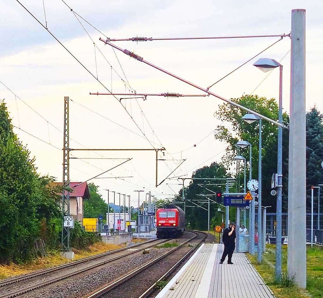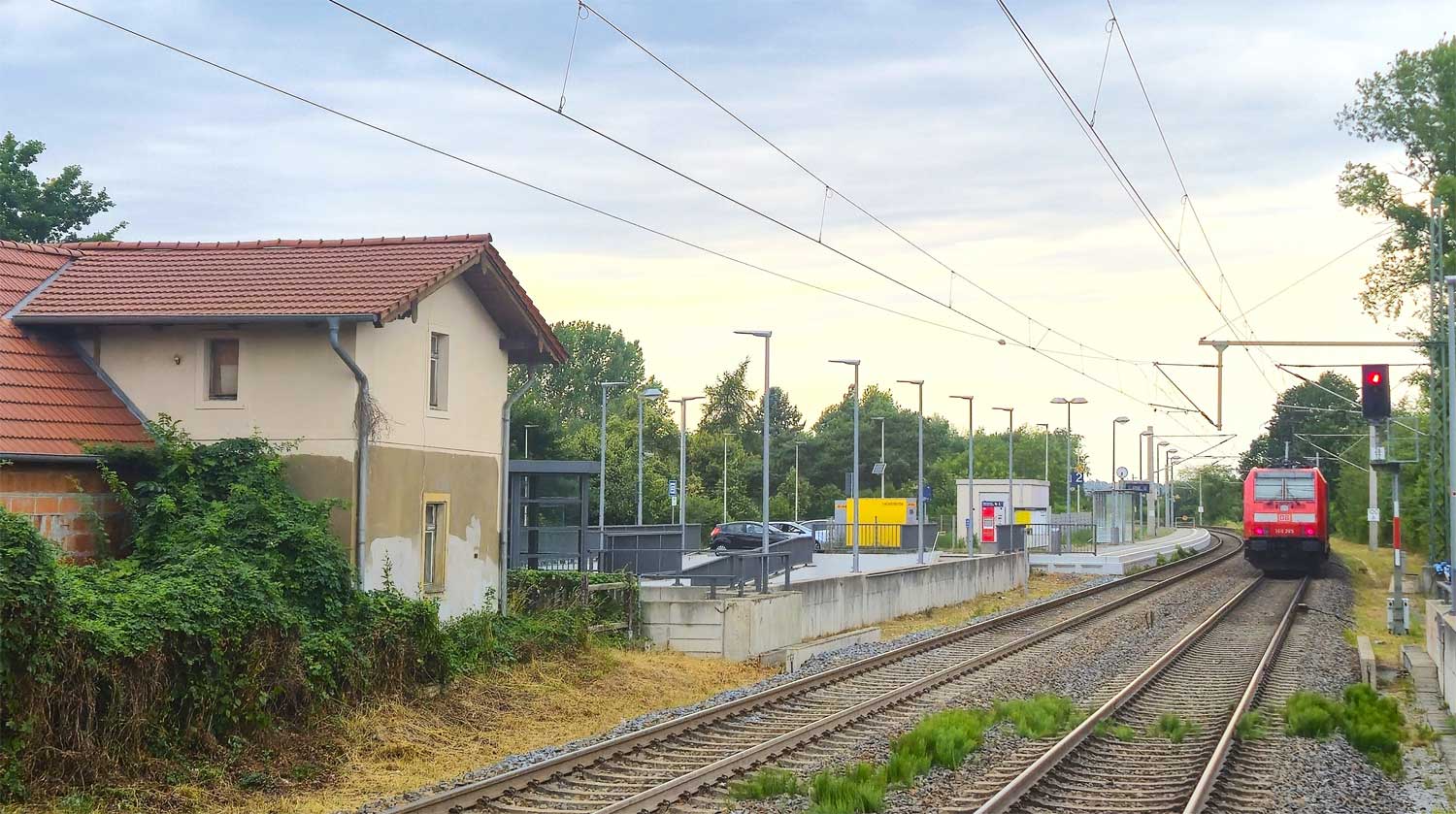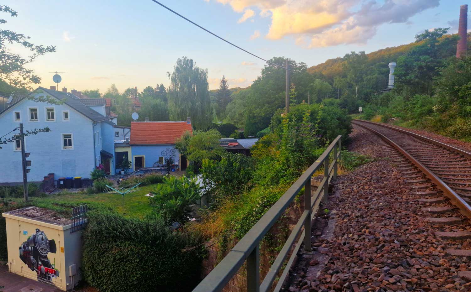 Man beachte auch die schiefstehende Lampe vor dem Bahnhofsgebäude.