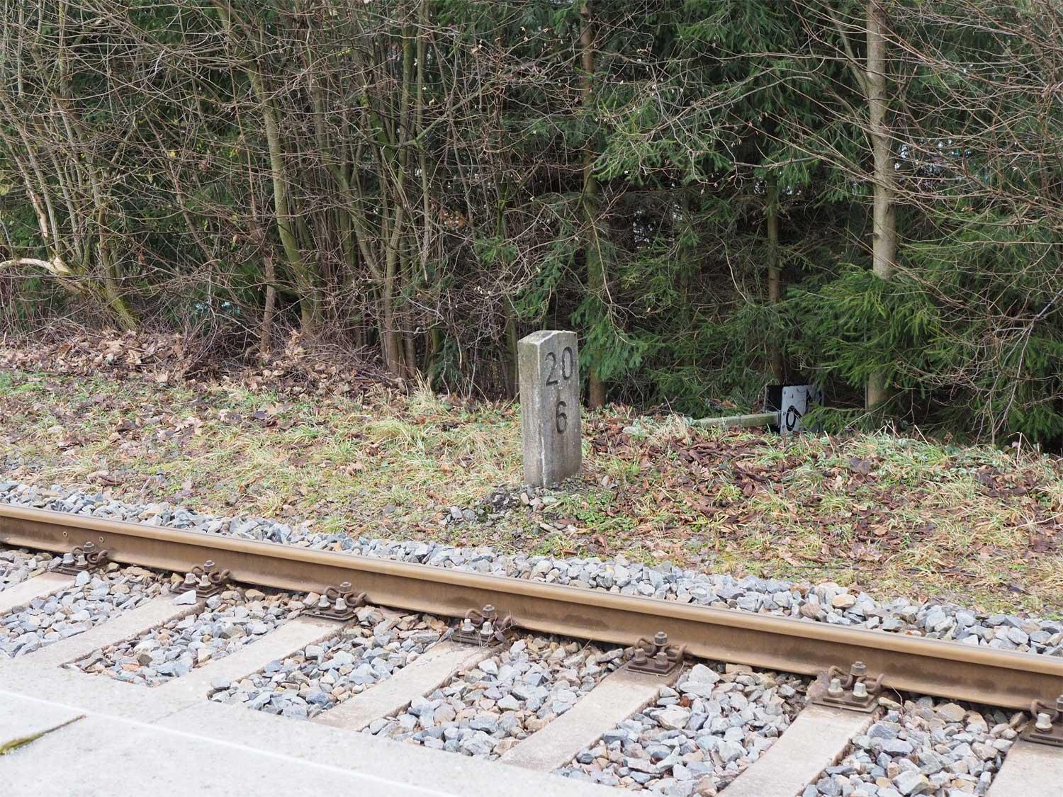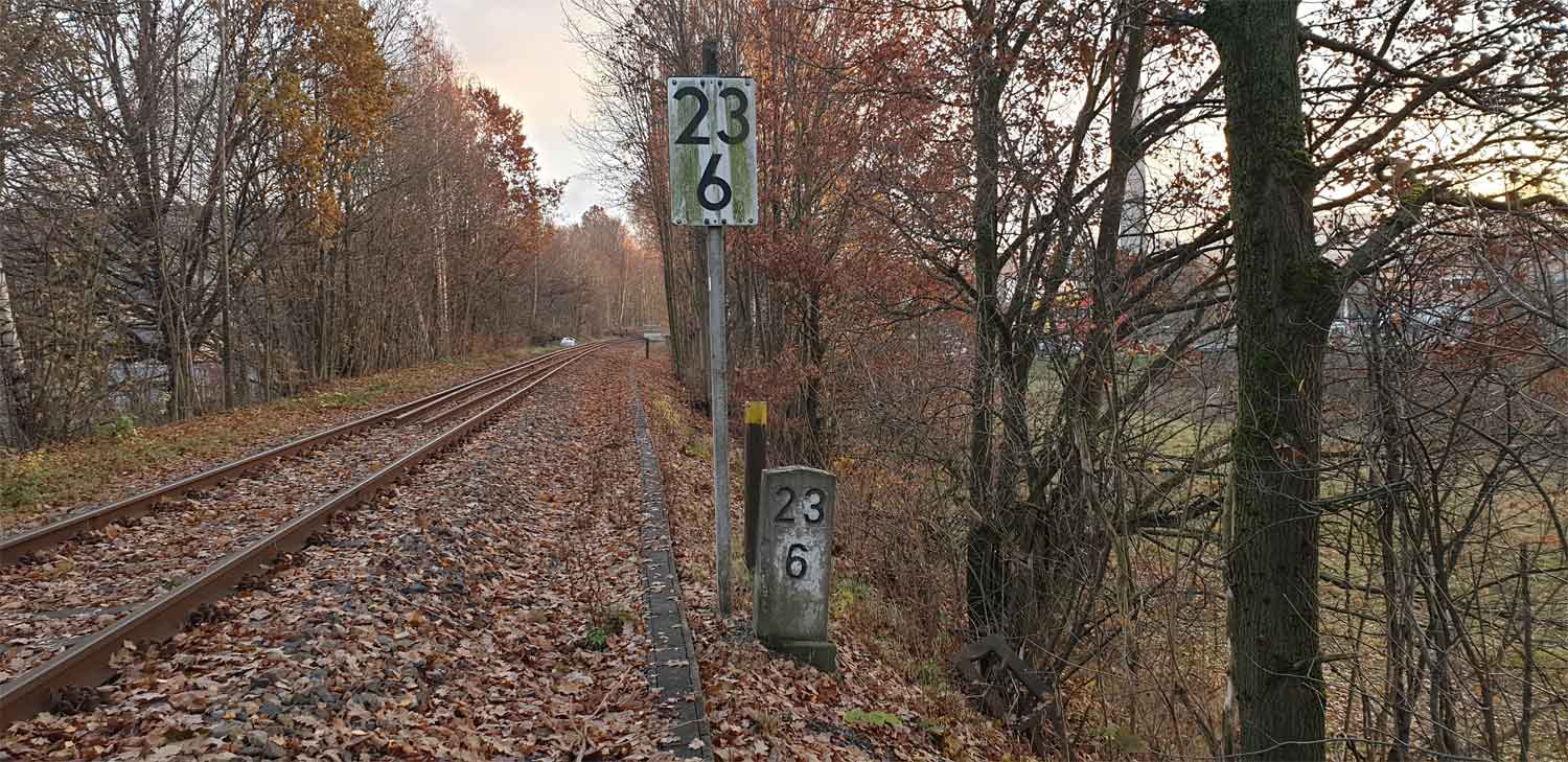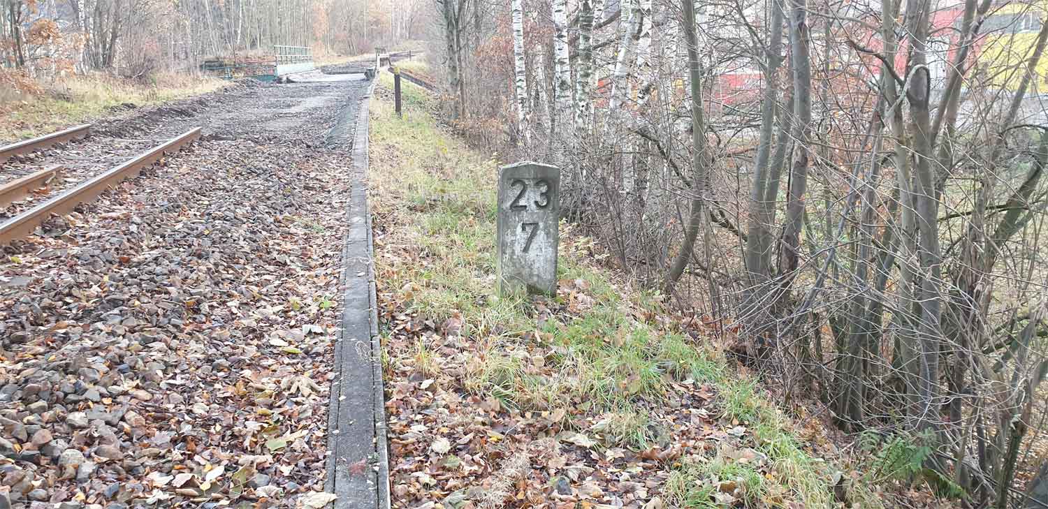 | km 25,69 der Strecke Aš (Asch) 0,0 - Grenze Tschechoslowakei/Deutschland 16,870 - Arnsgrün 18,54 - Adorf (Vogtl) 25,69 (AA) |