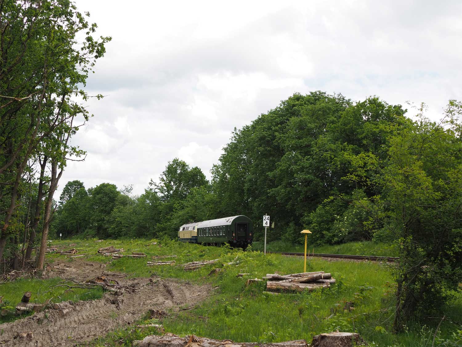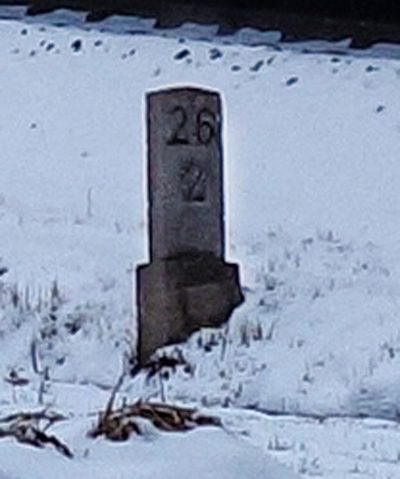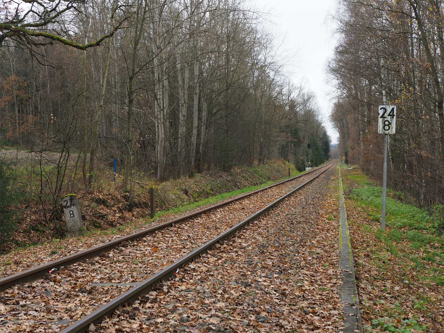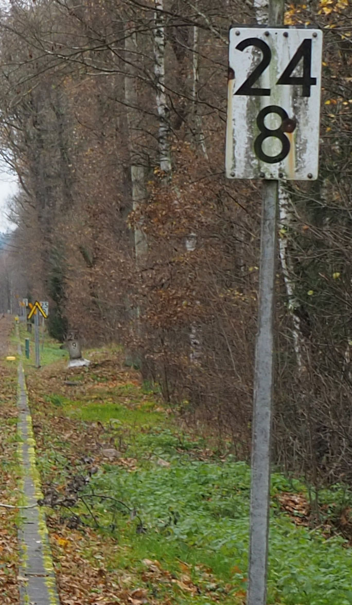 Rechts im Hintergrund ist der Stein km 28,3 zu erkennen